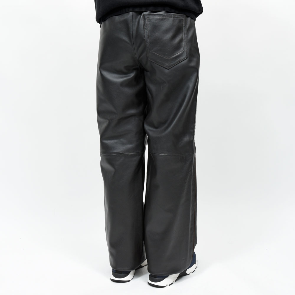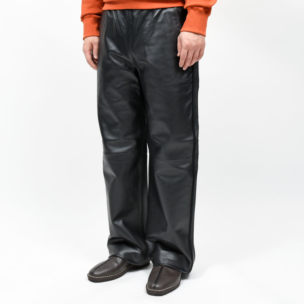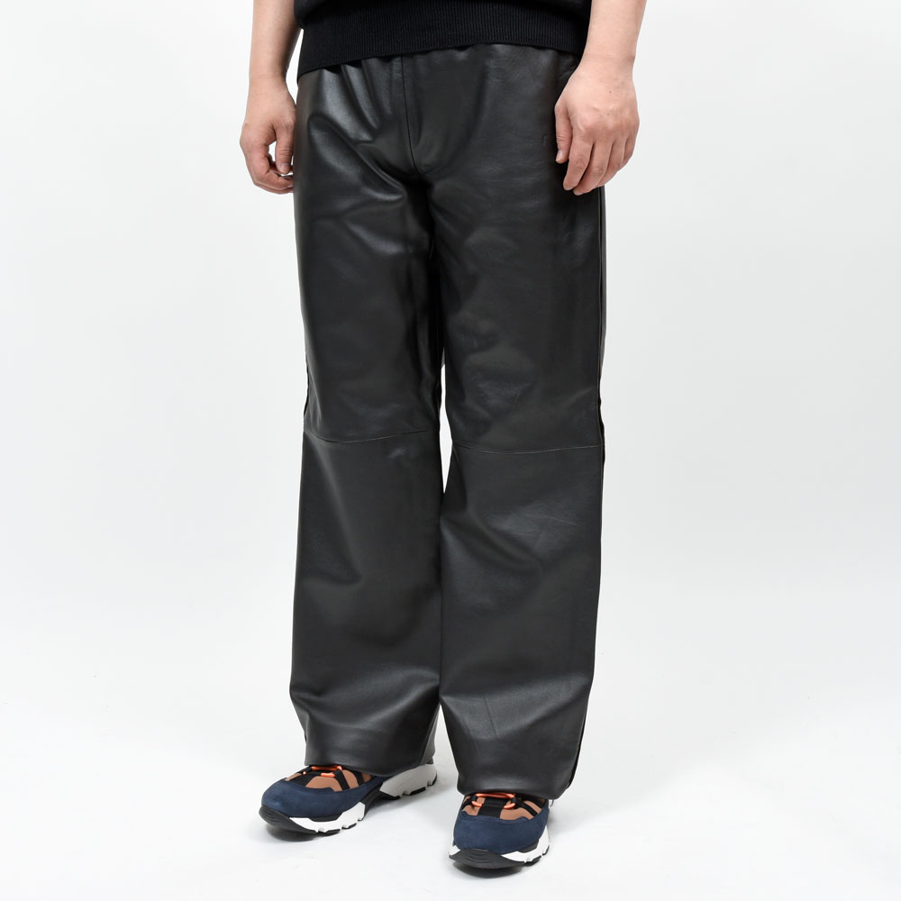 ということで今回もサイドライン付き、シャーリング仕様のレザートラックパンツをセレクト。どう穿いてもらってもアクセントになってくれるパワーがありつつ、シルエットは「今」を感じさせる塩梅になっていることで取り入れてもらいやすいものになっています。