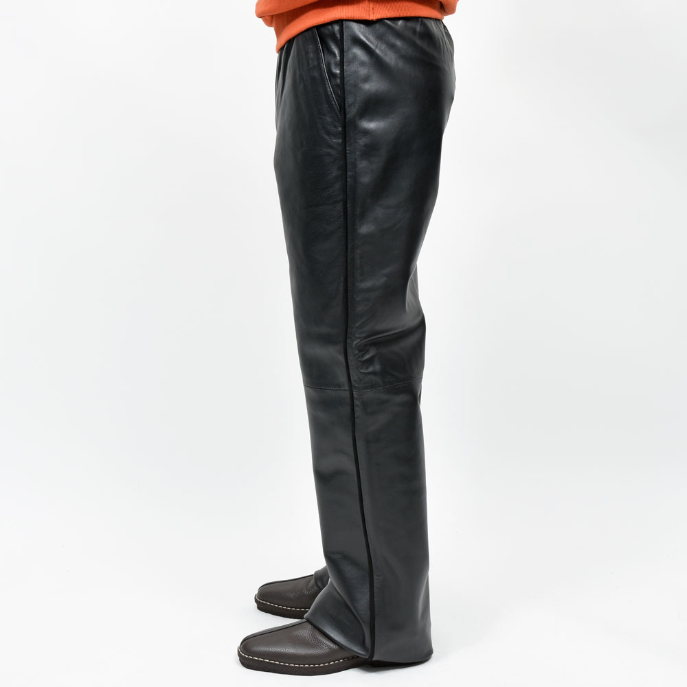 トラックパンツをベースにしたレザーパンツ、ありそうでなかった提案でした。取り扱いをスタートして一年が経ちましたが、かなり早い段階でソールドアウトしたのを記憶しています。