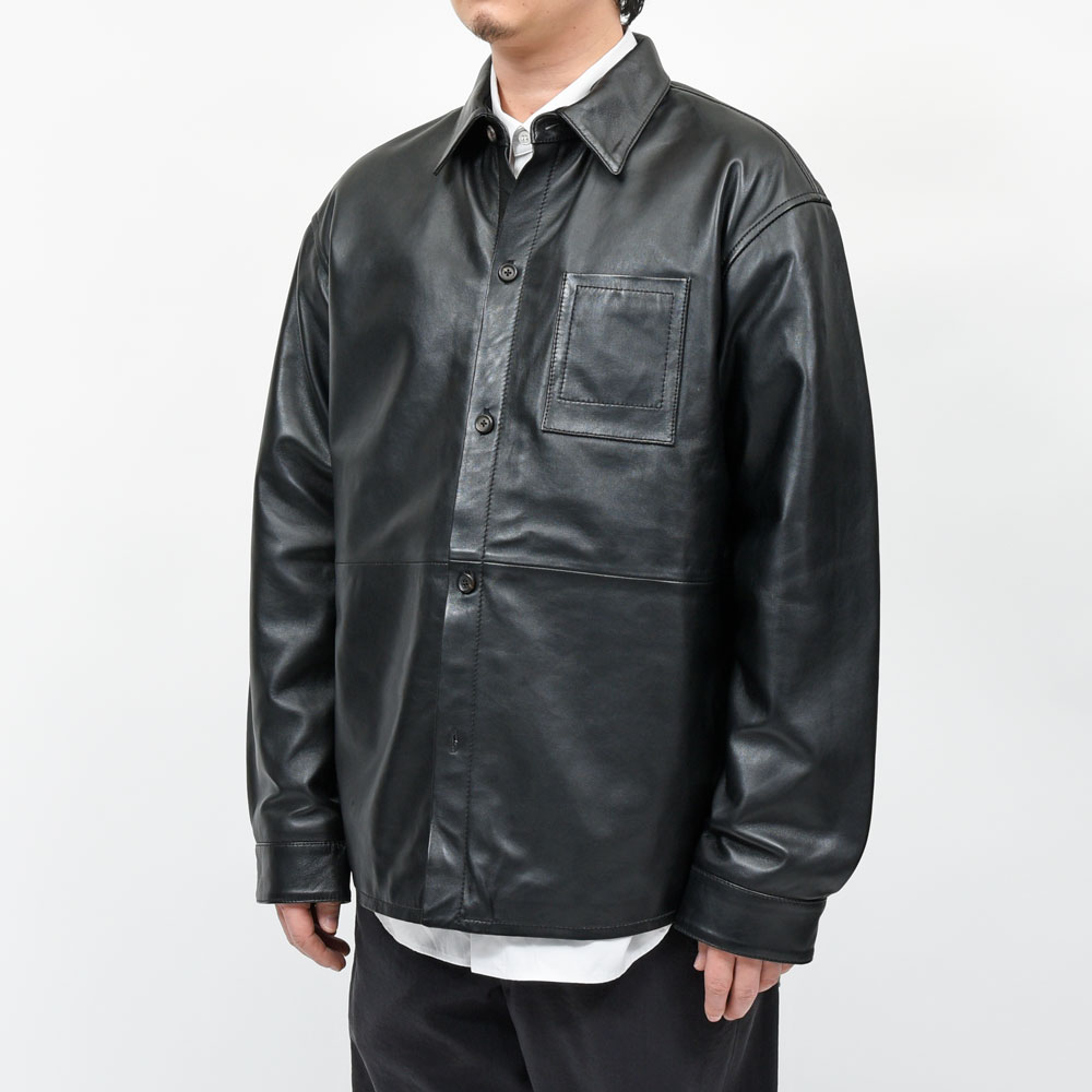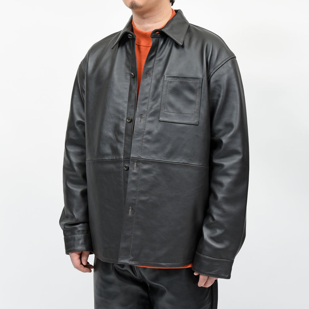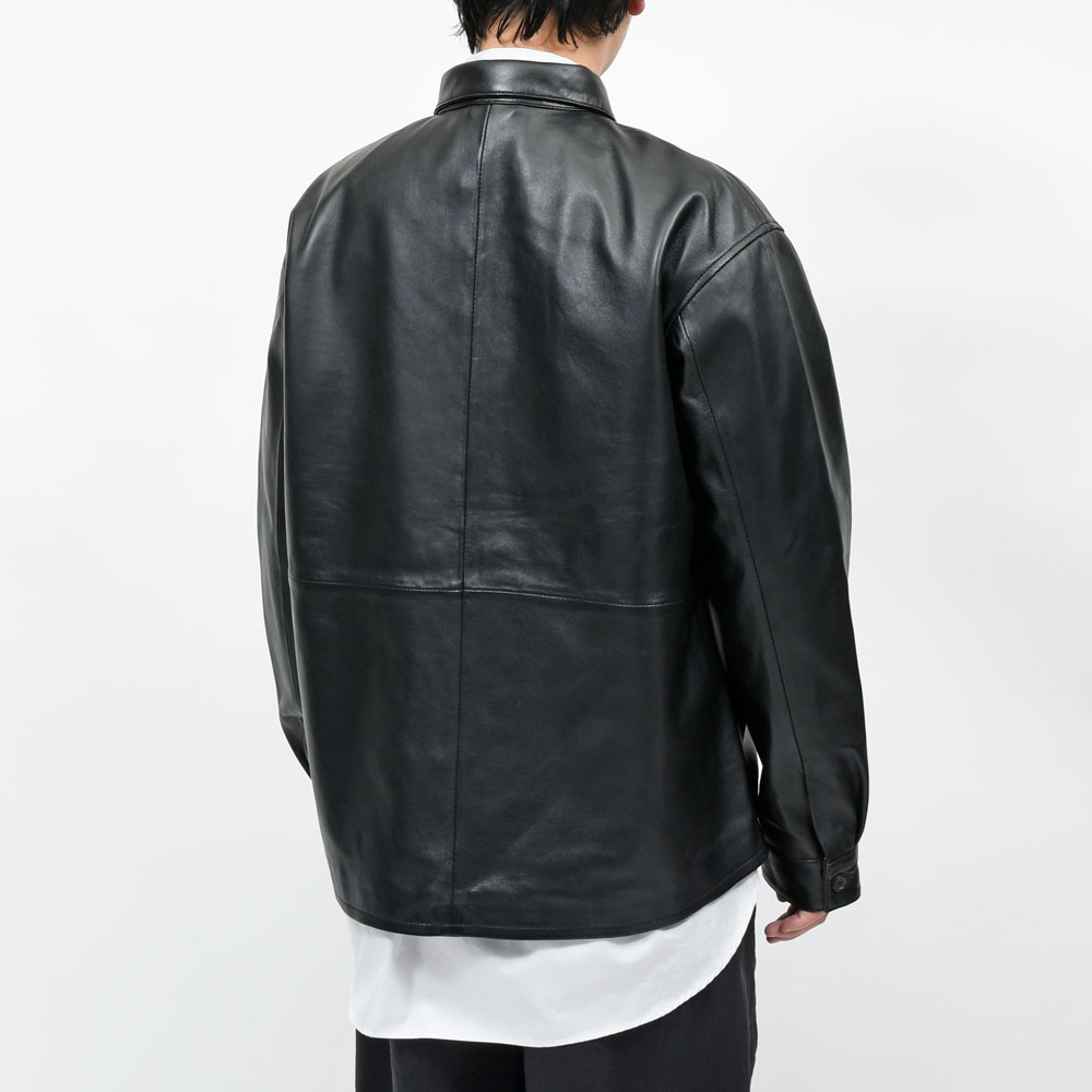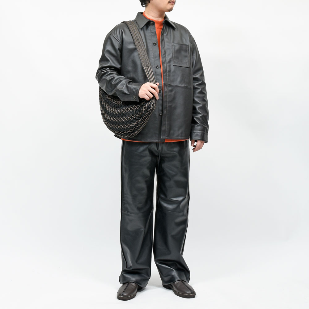 しなやかなレザーを用いたオーバーシャツ、ディティールはシャツでありながらアウターとして着用可能な塩梅の一着に。とはいえシャツの形ではありますので、アウターのインナーとしても着用してもらえるバランスに、こういった要素はコーディネートを組む上でもメリットになってきます。