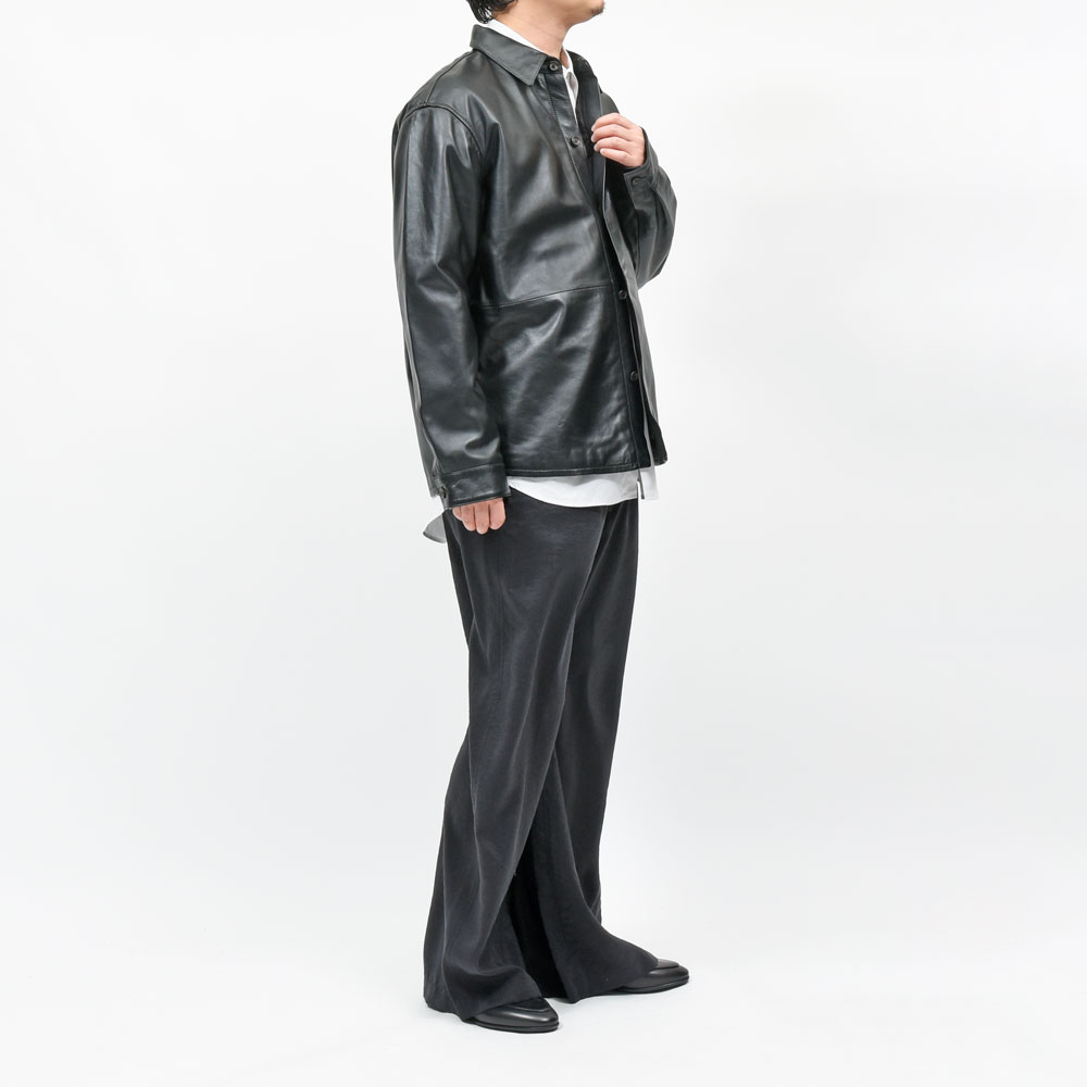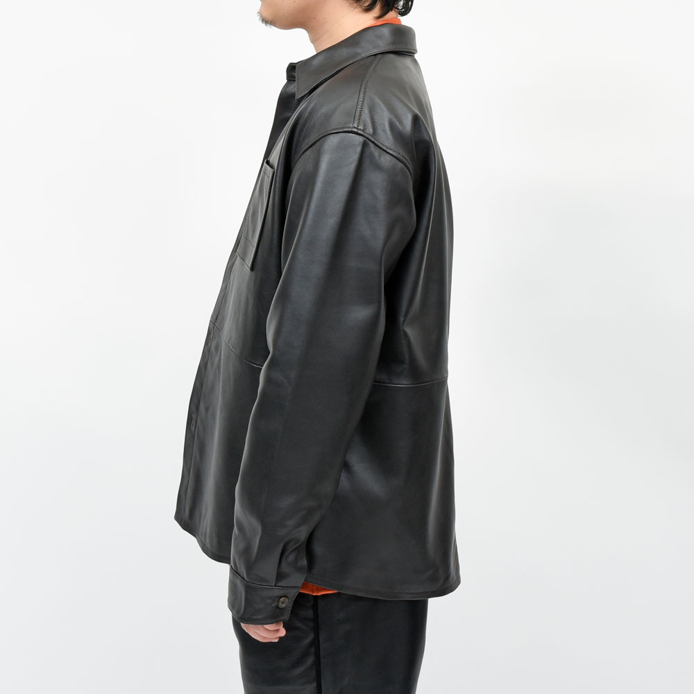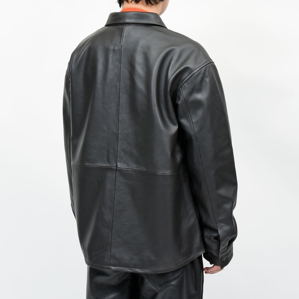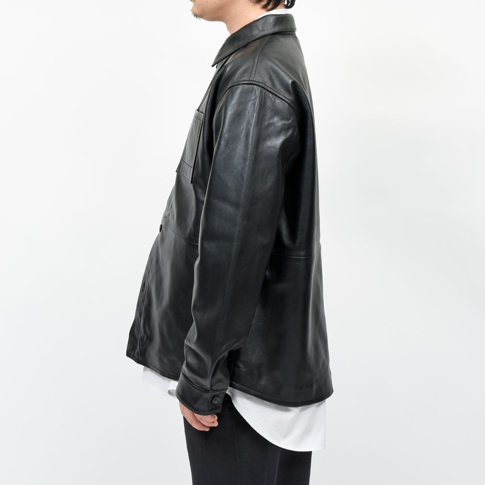 しなやかなレザーを用いたオーバーシャツ、ディティールはシャツでありながらアウターとして着用可能な塩梅の一着に。とはいえシャツの形ではありますので、アウターのインナーとしても着用してもらえるバランスに、こういった要素はコーディネートを組む上でもメリットになってきます。