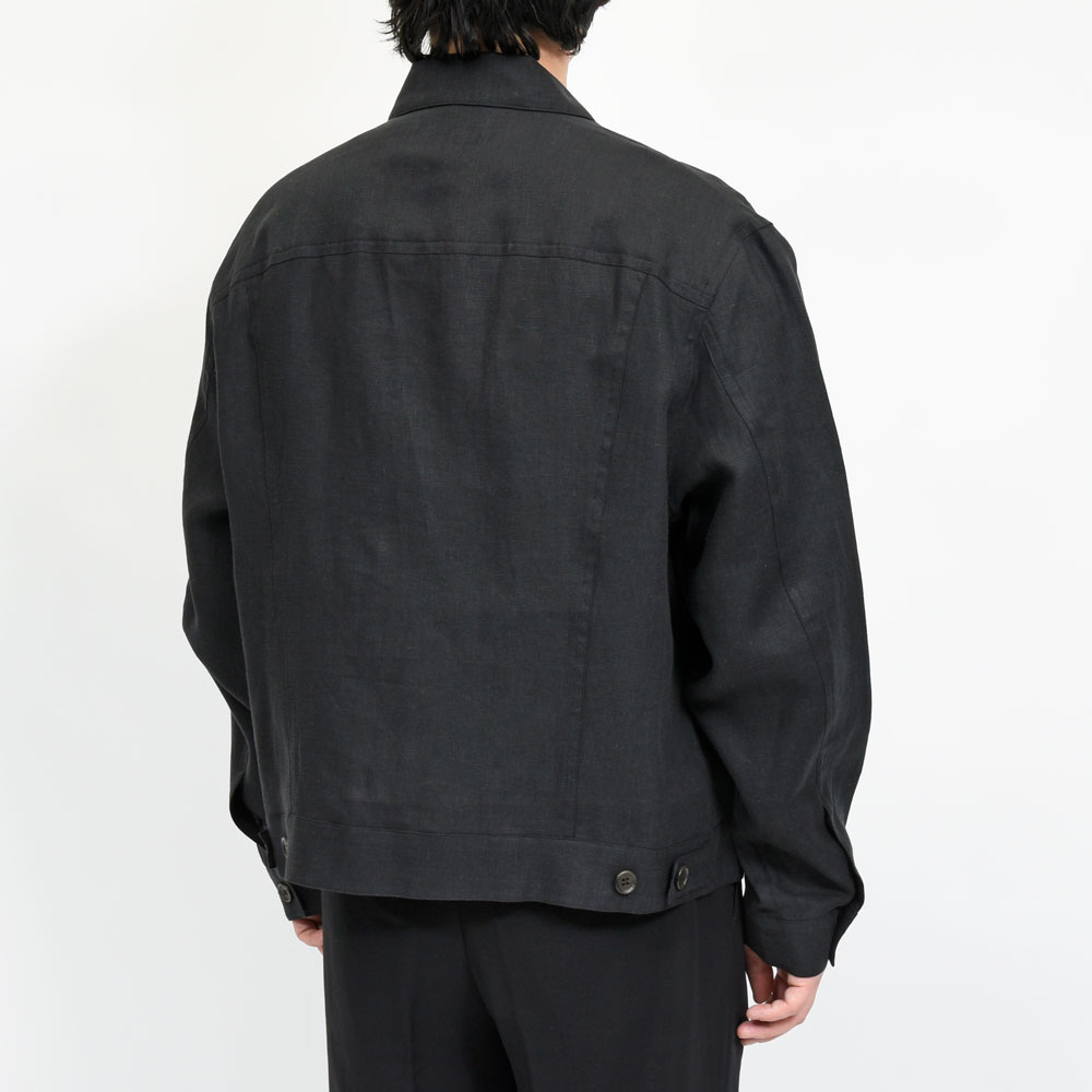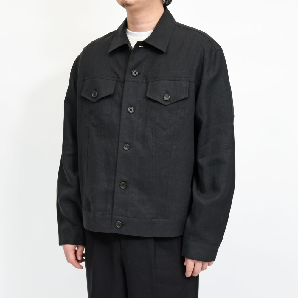 カジュアルアイテムの定番どころであるトラッカージャケットをAMBELL(アンベル)らしく解釈した一着。上質なリネン100%の生地はしなやかでとろみを感じさせるタッチに。また防シワ加工を施しているため、必要以上にクタッとし過ぎないようにしています。