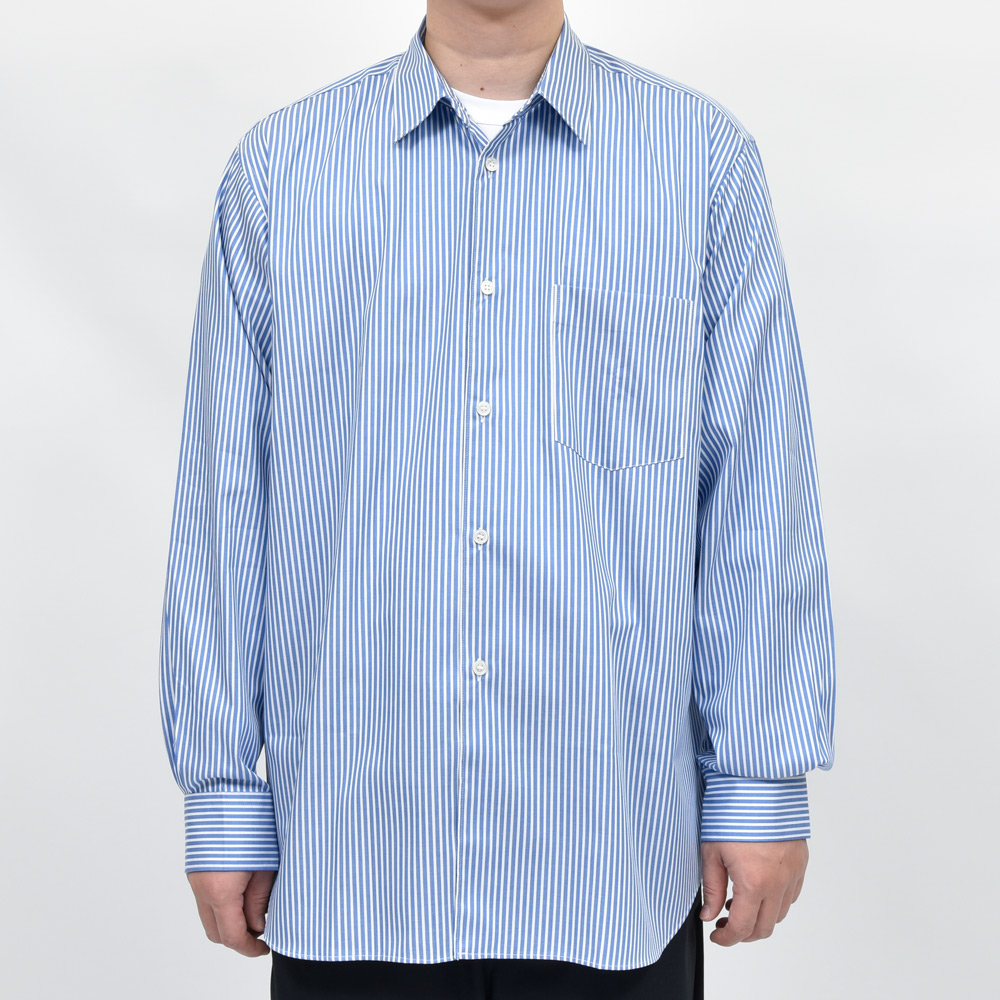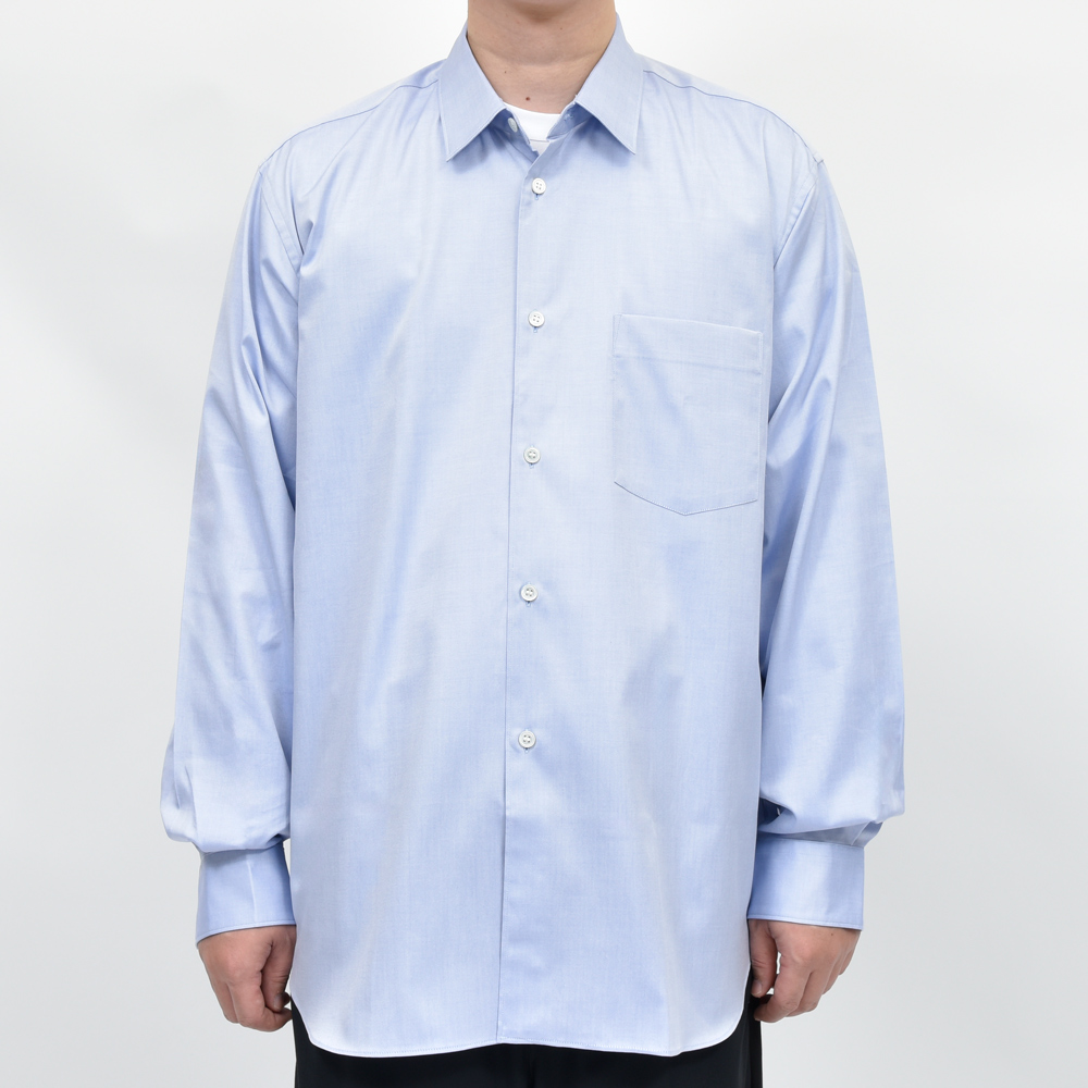 生地感はややしっかりめになっていまして、ドレープはそこまでですがしっかりとリラックス感のあるシルエットを保ってくれる感じです。ブルー系のカジュアルシャツをお探しであれば選択肢にいれてもらってもいいかもしれません。