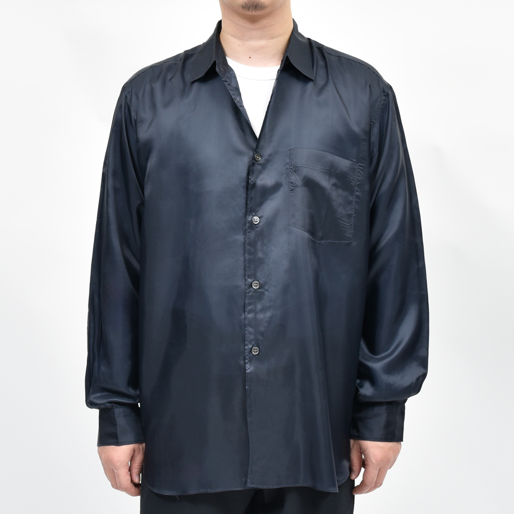 ジャケット、スーツの裏地のイメージがあるキュプラ、今回はメインファブリックとして採用されています。生地感は薄手でドレープを感じさせる仕上がりに、絶妙な光沢感がコットンにはないムードを発揮してくれています。