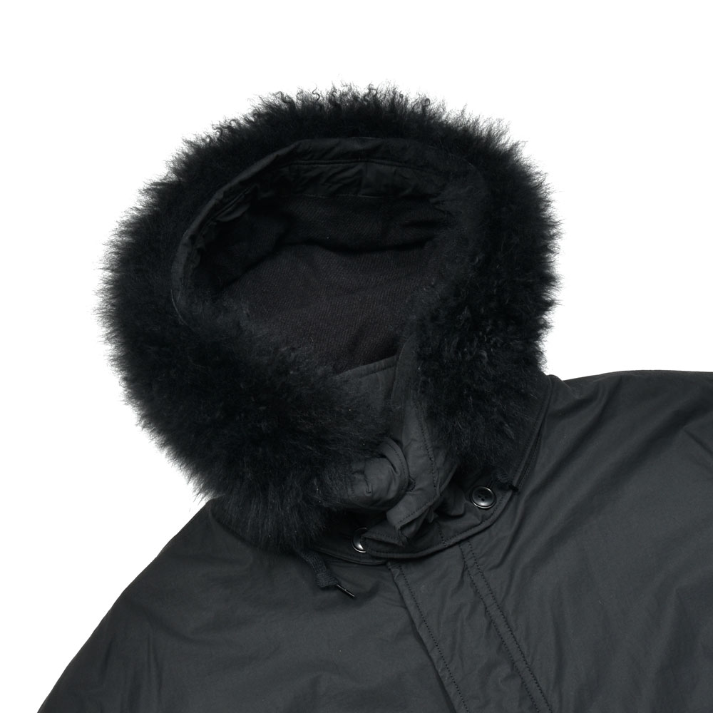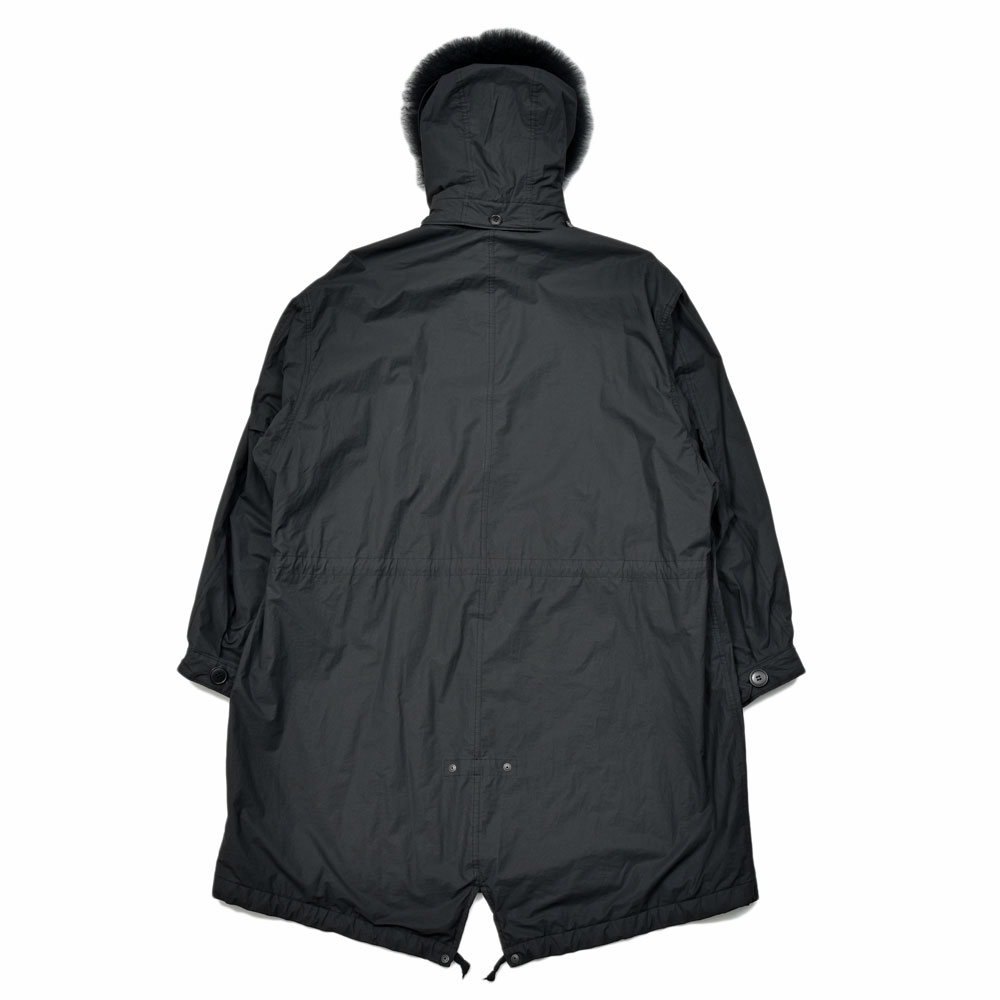 ブラックカラーのミリタリーフーデットコート、ソリッドな印象がありつつ素材は軽やかなコットンナイロンのものを採用することで重厚になり過ぎないものになっています。また裏地も同様に柔らかく軽いウール生地を採用することで、ストレスなく着用することが出来る仕上がりに。