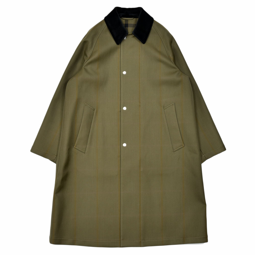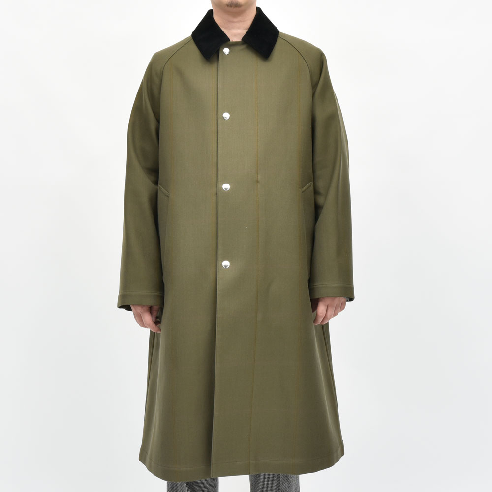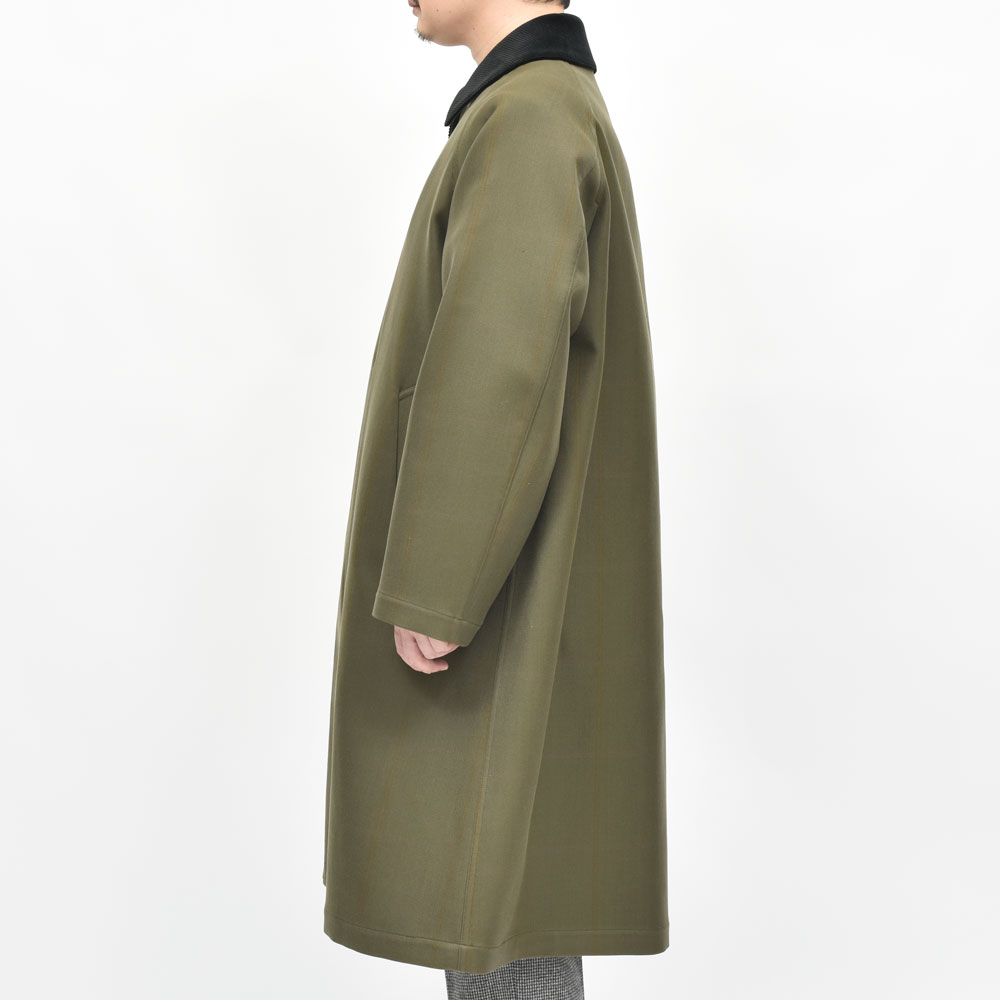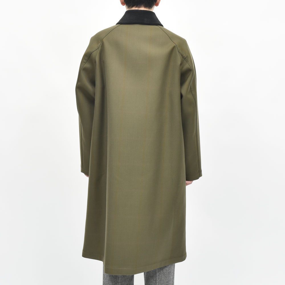1940年代のバルカラーコートをベースにしつつ、ラグランスリーブの流れや引きで見た時のAラインの美しさはこのブランドならではの美的センスが宿っています。