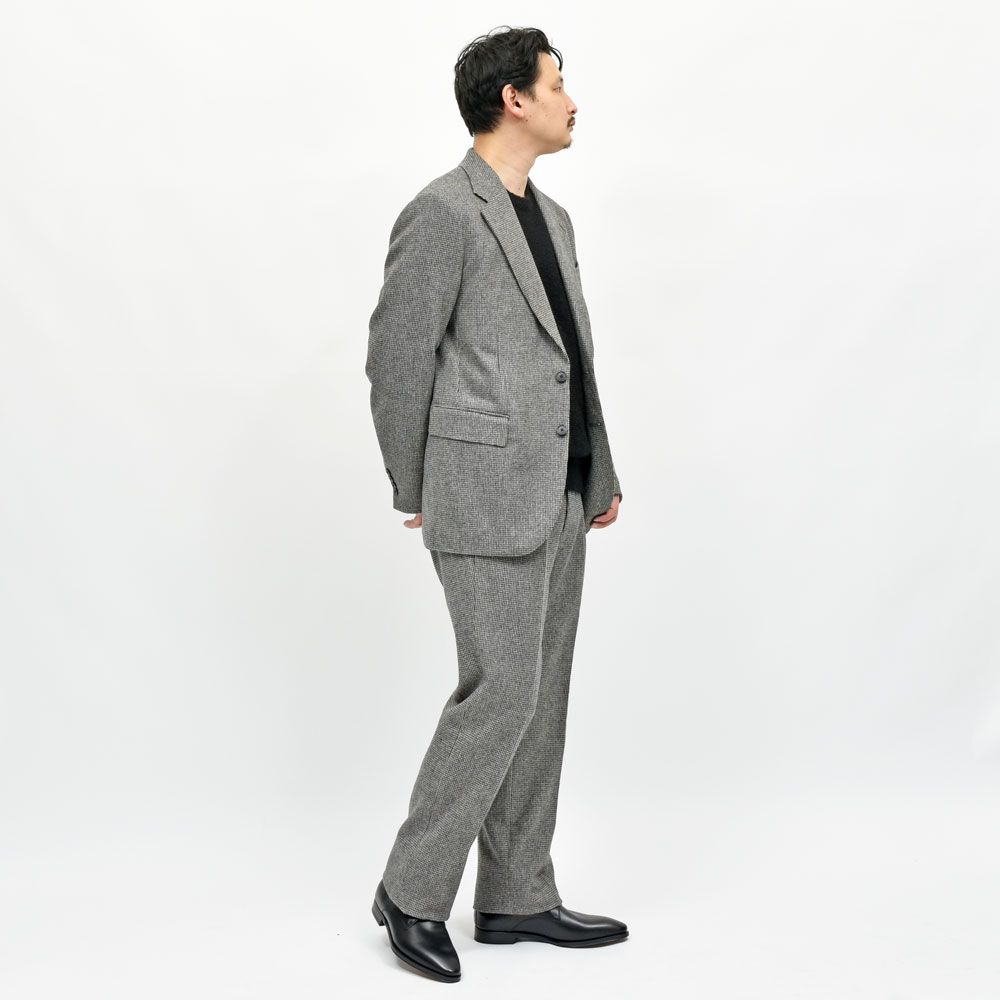 生地はJohn Foster社のフランネル生地を採用、それをカラー別注することによって仄かに独自性を感じさせる塩梅に。ブラック、グレー、ベージュを組み合わせ、ハウンドトゥースの目は非常に細かなものに、柄物であっても取り入れやすく色合わせにも困らないバランスに仕立てられています。