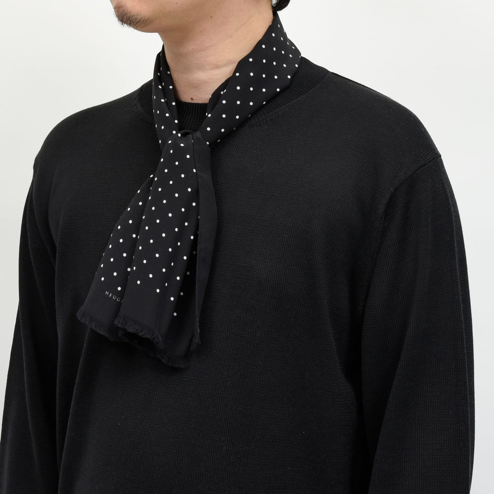 コンパクトなサイズ感のスカーフに整然と並べられた小さなドット、文字にすると簡単ですが、実際に巻いた時の収まりの良さを体感すると、緻密な計算があってこそだな、、、と思わされます。