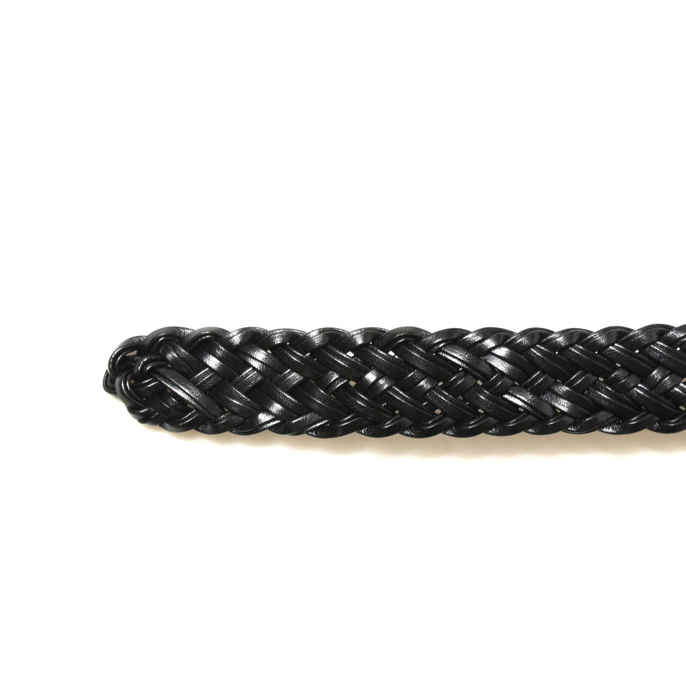 細かくカットしたレザーをテープ状にし2本ずつ束ね編み込むことで床面が出ないように工夫されています。また、ベルトの顔であるバックルはゴールドカラーのオリジナル仕様、スクエア型のシンプルで洗練されたムードを醸し出してくれます。