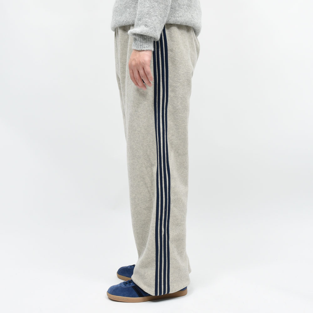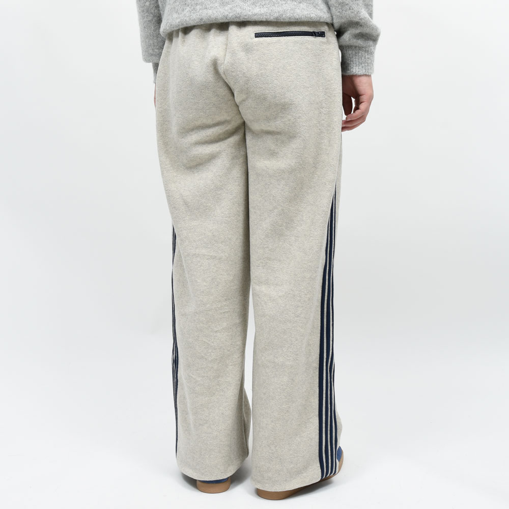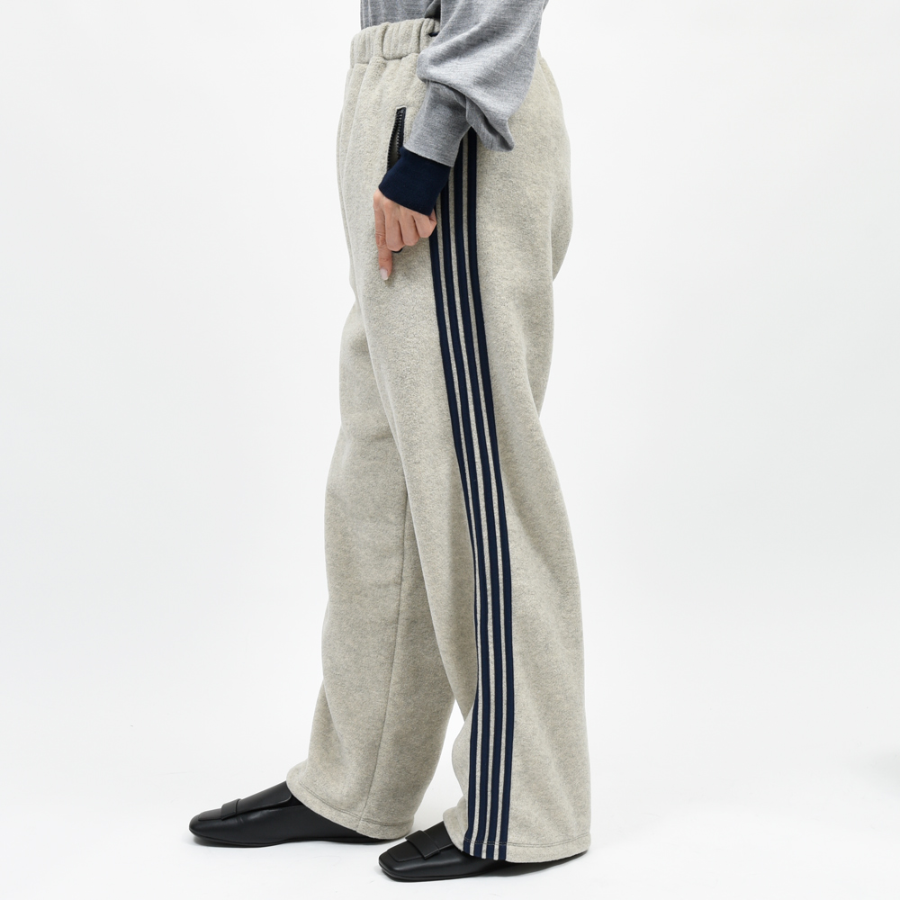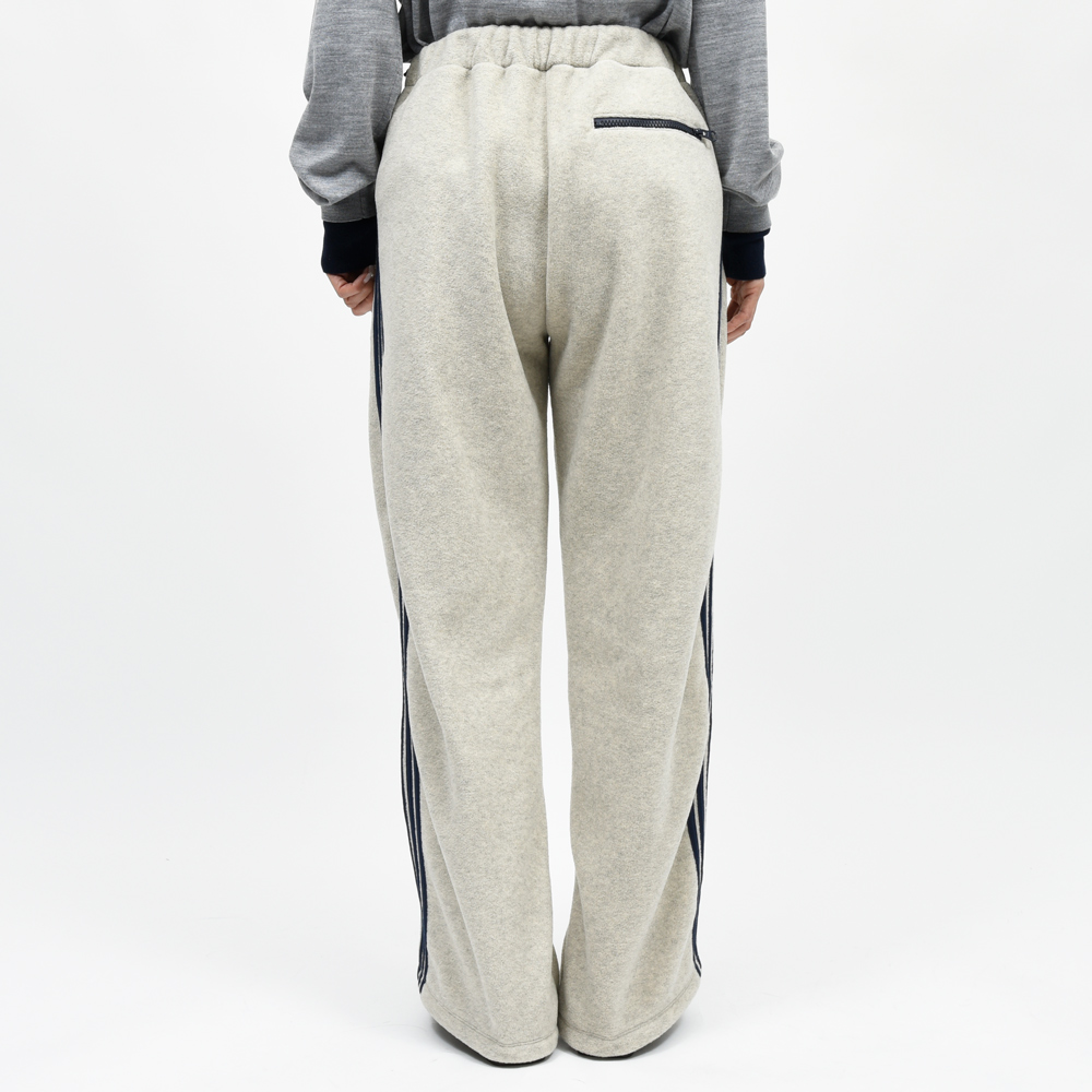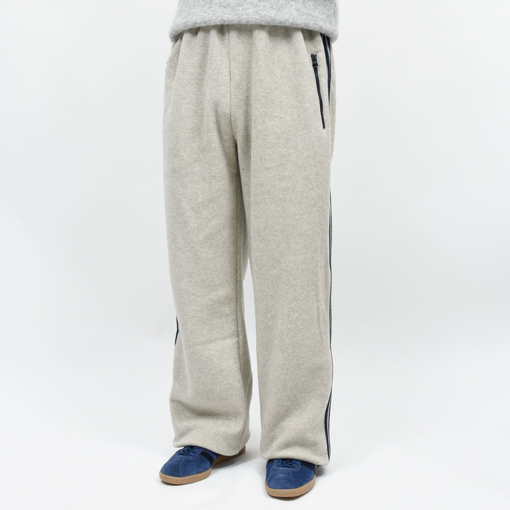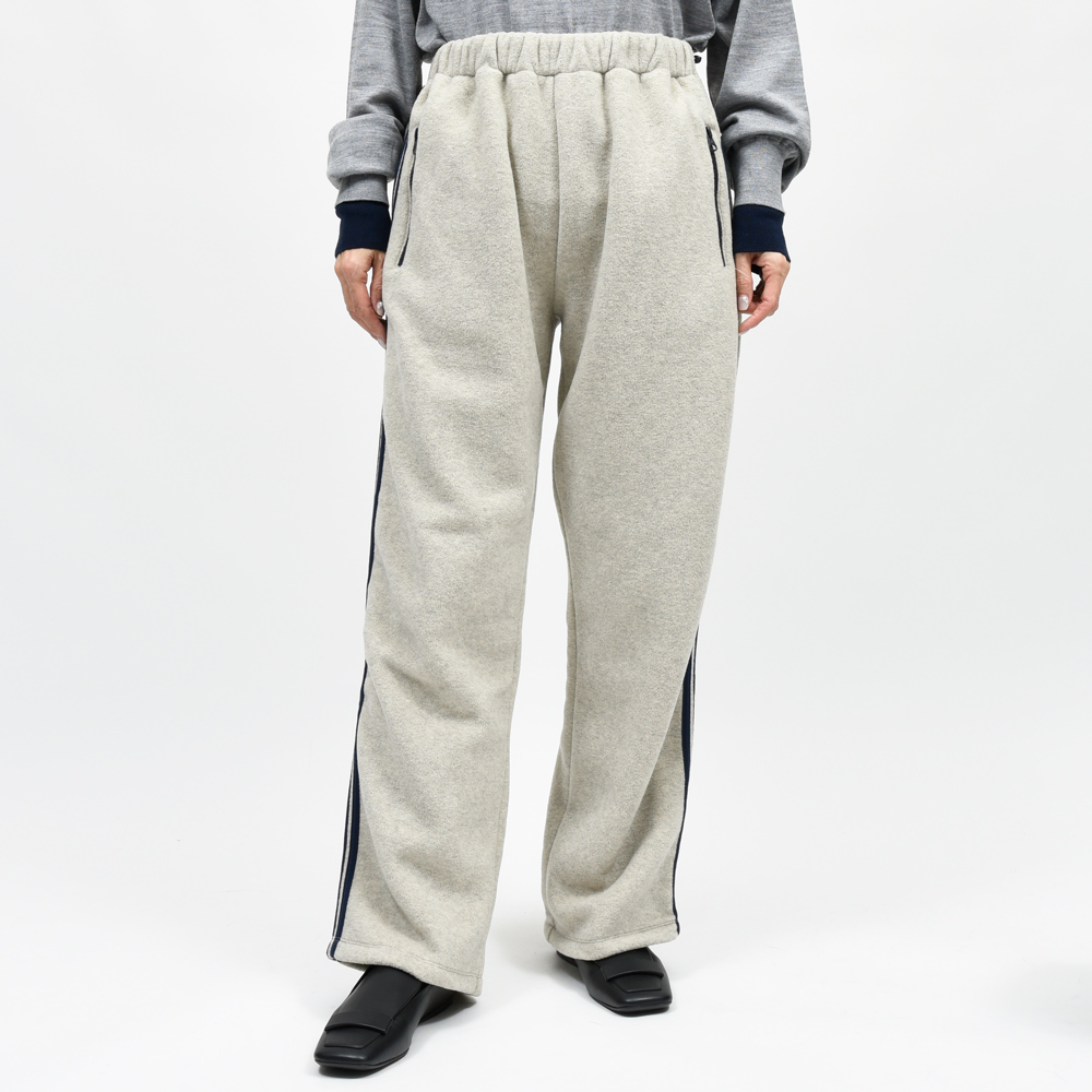 INSCRIRE(アンスクリア)らしいルーズシルエットのトラックパンツ、オートミールの柔らかな色合いにネイビーのサイドラインをセットすることで緩急をつけています。また素材はフリースにすることで冬場でも穿いていただけるものに。またフリース素材はタンブラー加工を施すことによってピリングを起こしにくいように仕上げています。