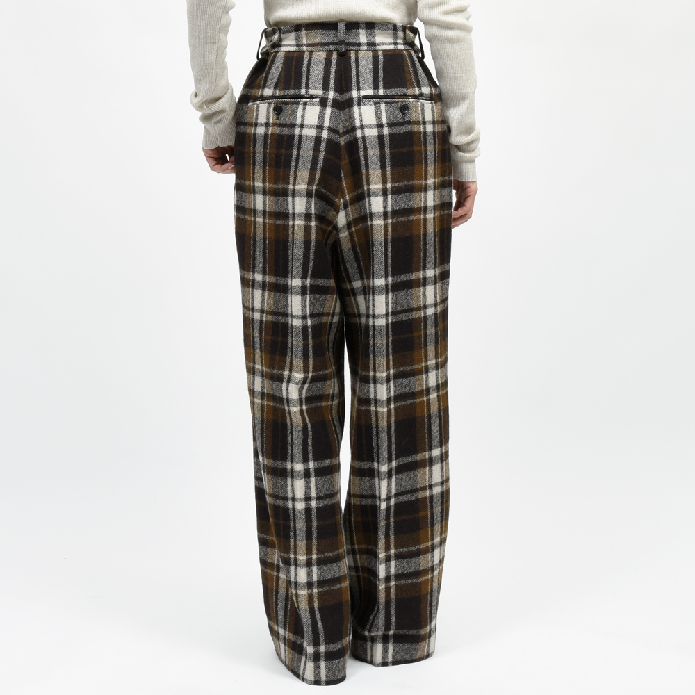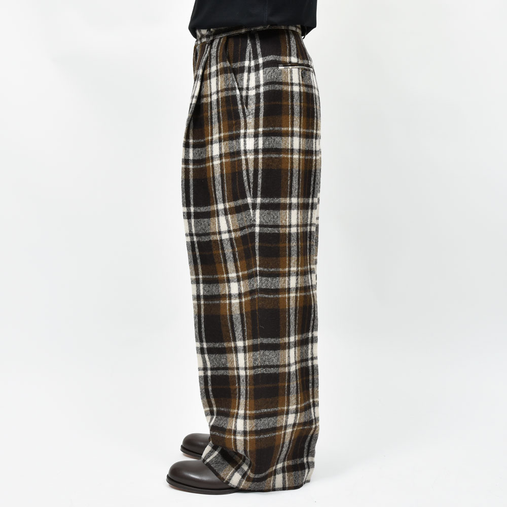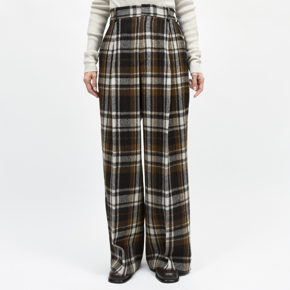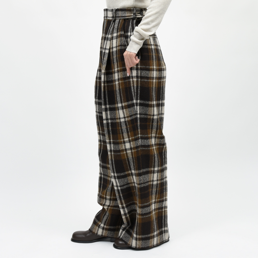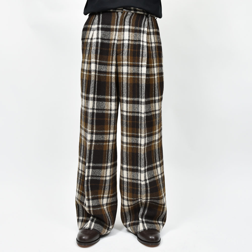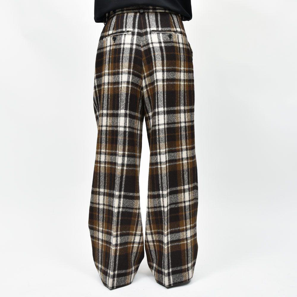 INSCRIRE(アンスクリア)のチェックワイドパンツ、かなり幅の広いタイプのものでしてシルエットだけでもかなりの存在感があります。それにプラスしてオリジナルのチェック柄をセットすることで、ニュークラシックなムードを体現しています。
