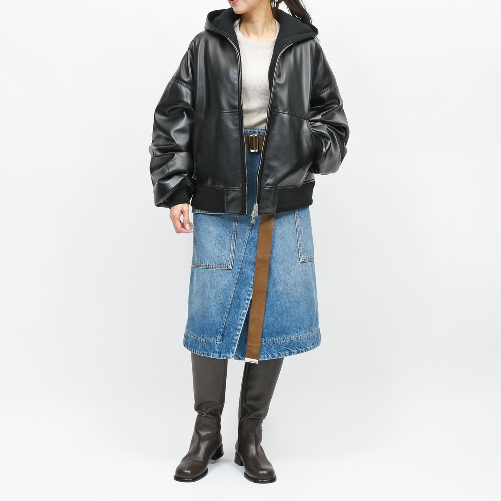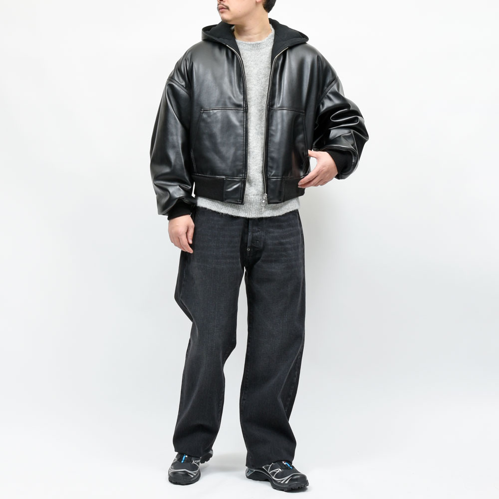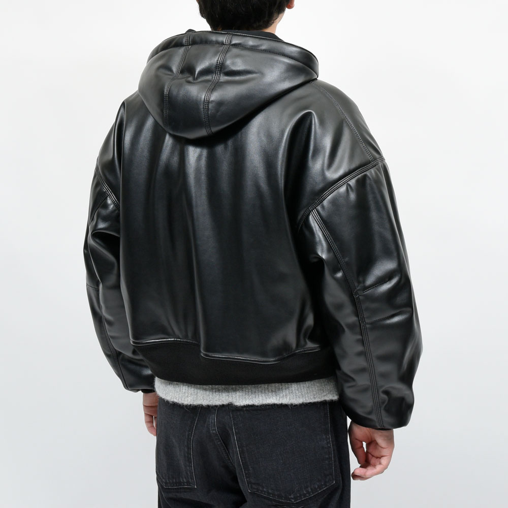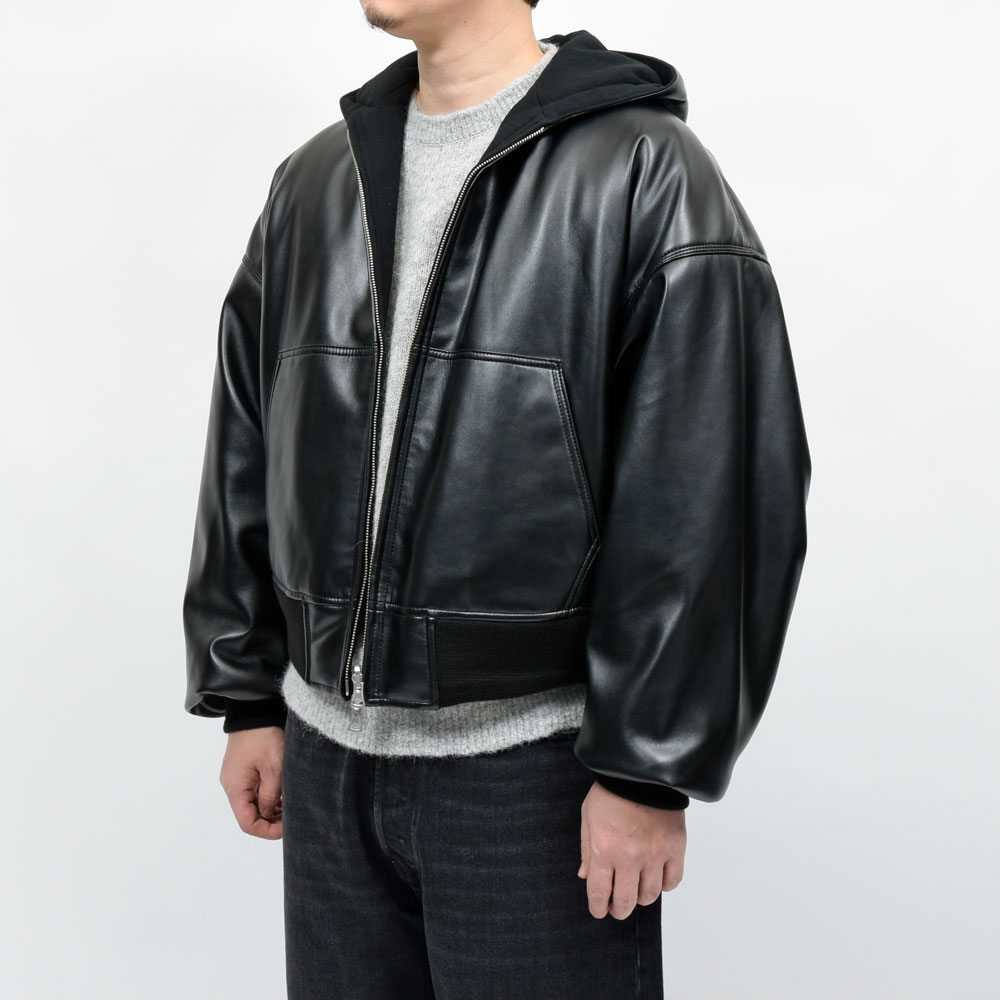 ベースになるのはシンプルなスウェットフーディ、それをINSCRIRE(アンスクリア)らしく再構築した一着。イタリア産のフェイクレザーはしっとり、もっちりしたタッチになっていまして、ボリューム感のあるシルエットととも好相性となっているいます。