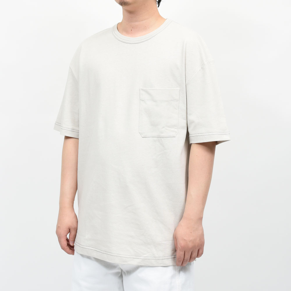 シンプルなパッチポケット、ネックラインはリブ仕上げ、クルーネックにしてはやや深めの設定になっているのも「今っぽさ」を感じさせます。ステッチはベースカラーに対してコントラスト効かせたり、トーンを合わせたりとカラーによって変化します。