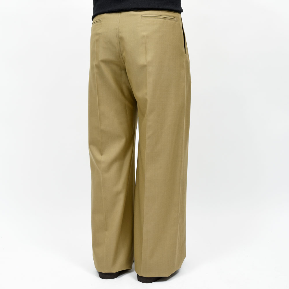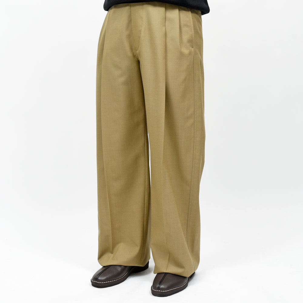 生地はポリエステルウールのトロピカルを採用、比較的ハリのある生地感とプリーツが組み合わさることで立体感のあるシルエットを楽しむことができます。ウエスト部分はサイドアジャスターとベルトループが装備され、汎用性は高め。