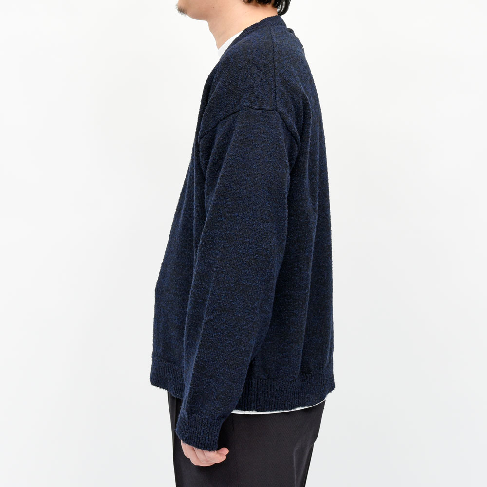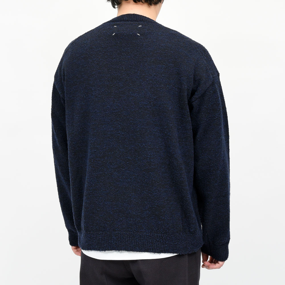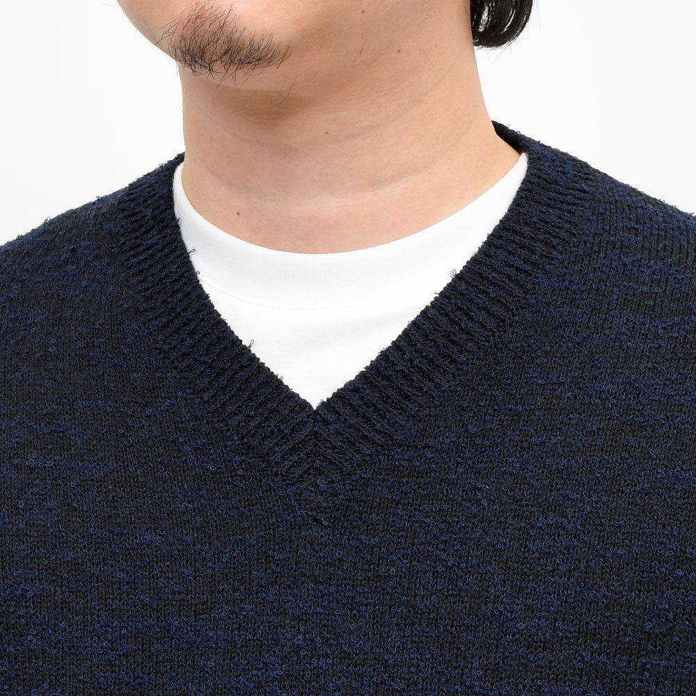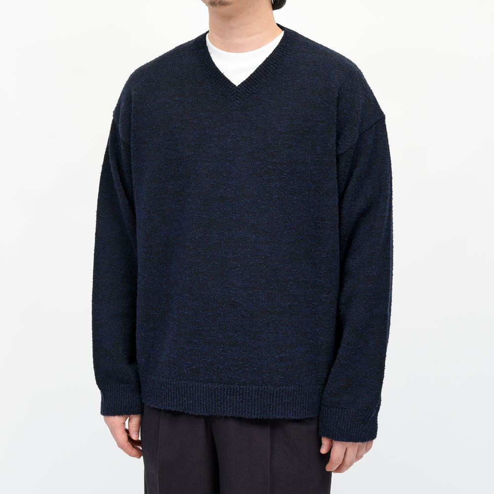 Maison Margiela(メゾン マルジェラ)のVネックニット、ブークレ調のタッチにメランジの奥深い発色が魅力的な一着となっています。ニットの中ですとここ最近再び注目されているVネック。