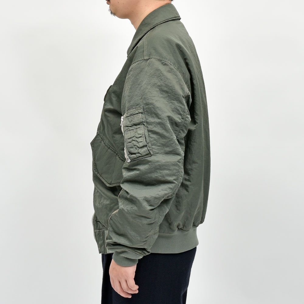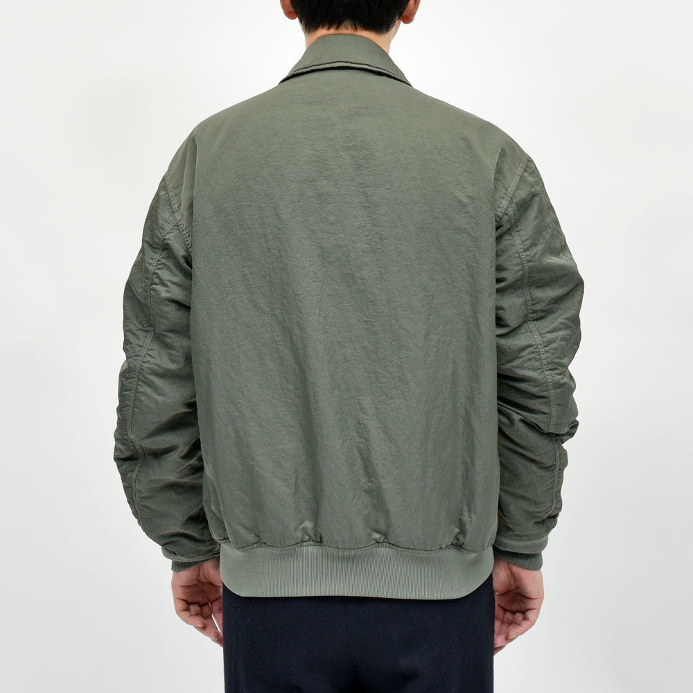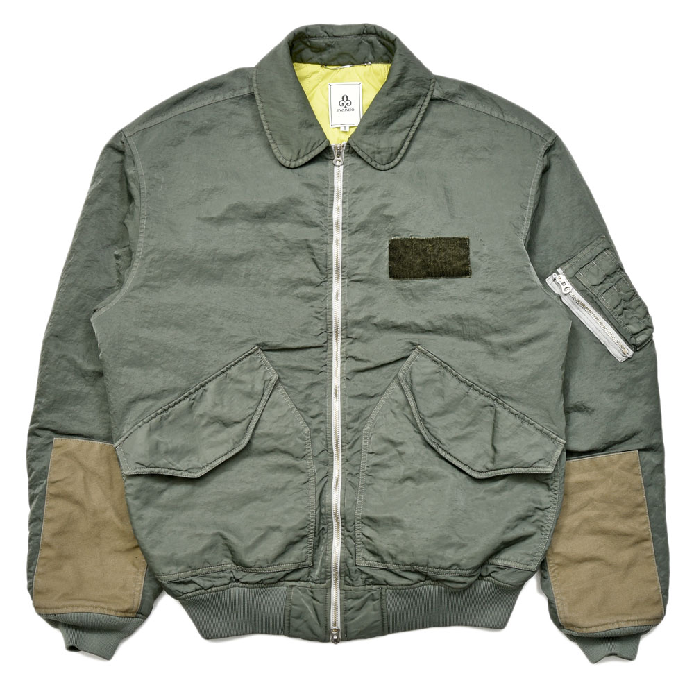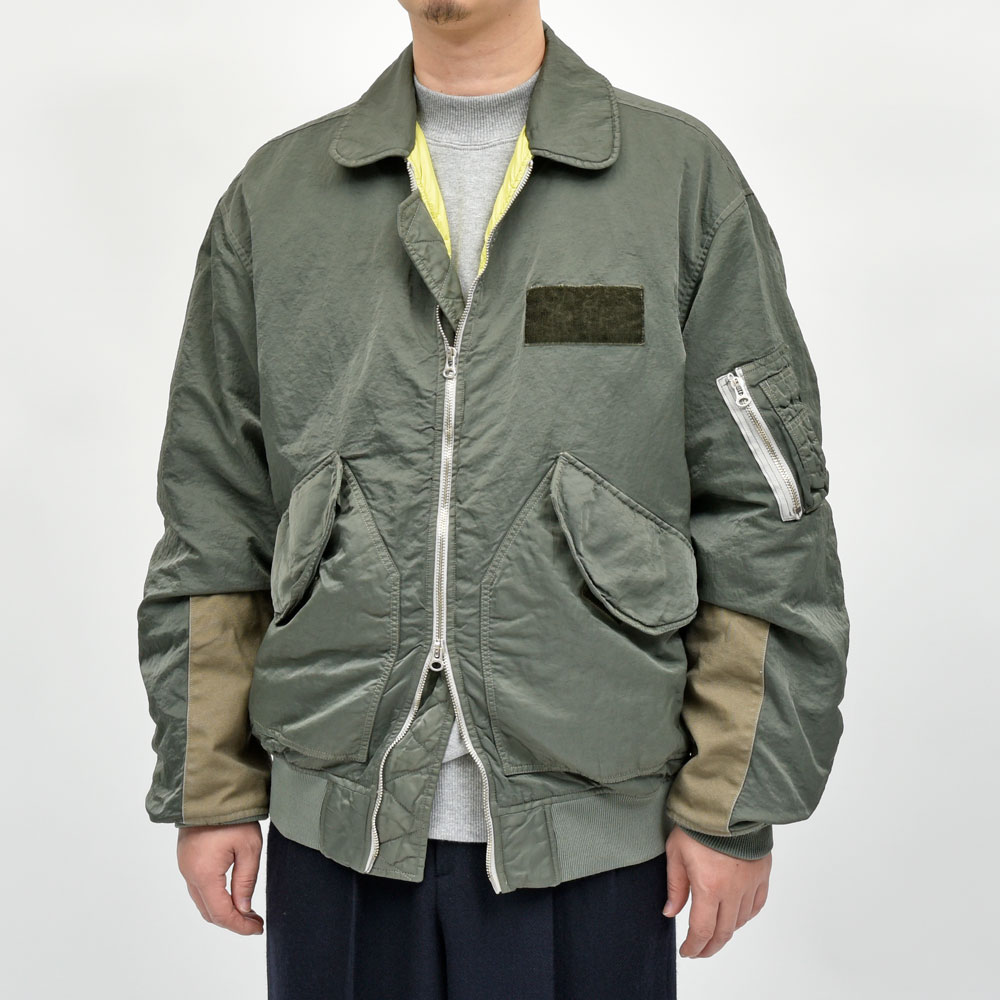 いわゆるフライトジャケットをベースに製品染を施しパッチを付けることでユーズドライクなムードを表現、ただそれだけではなく裏地をオレンジからネオンイエローに変更することでよりモダンな印象に仕立てています。