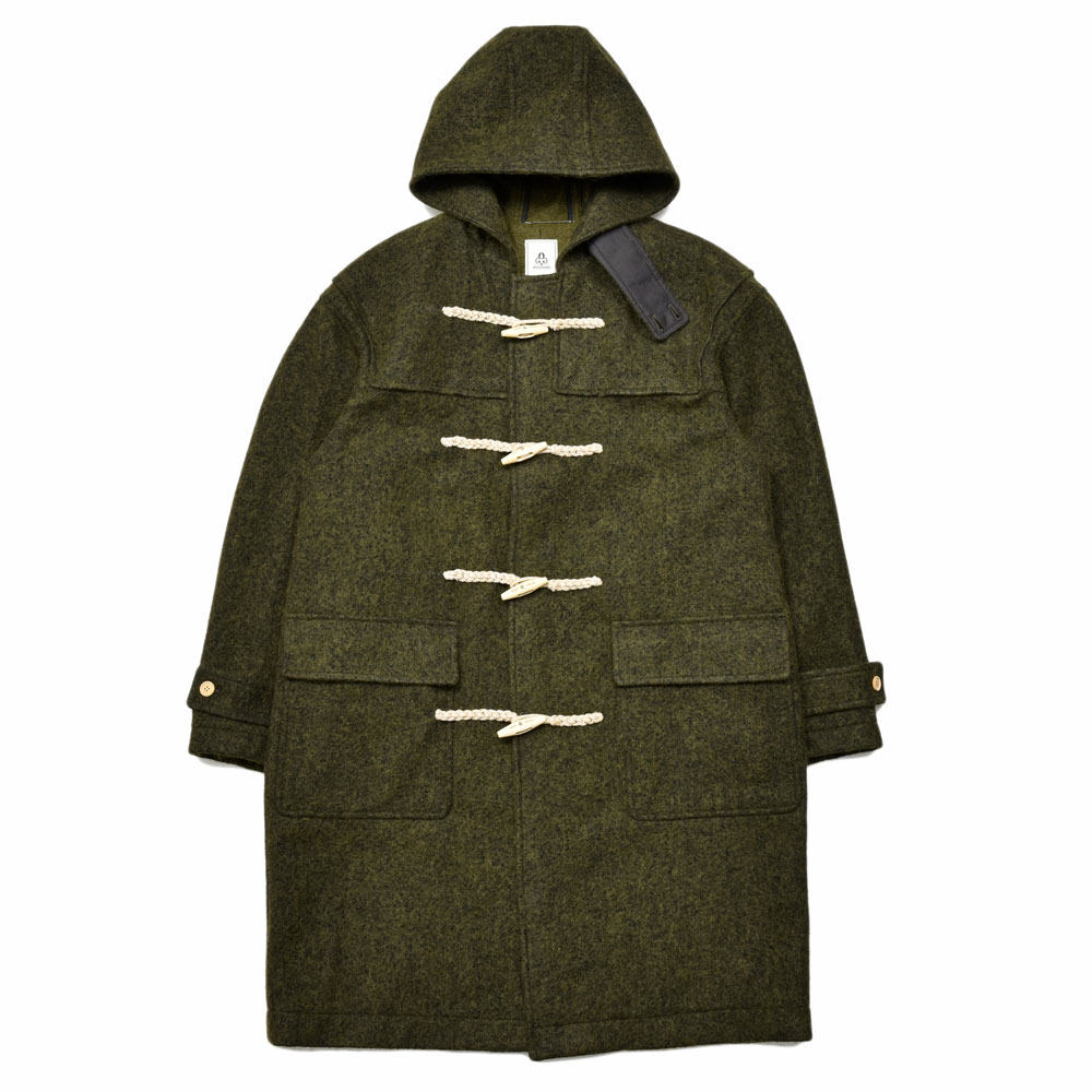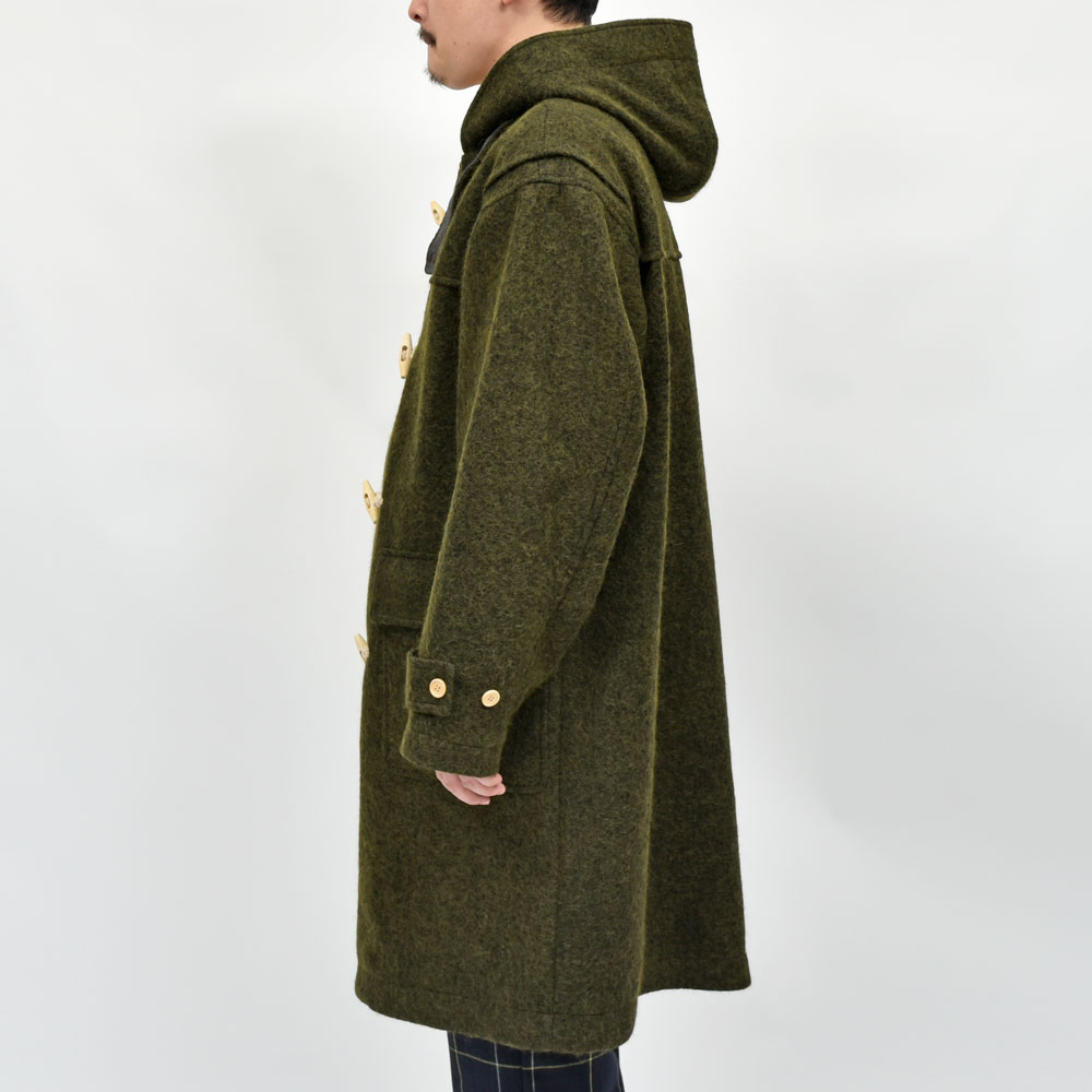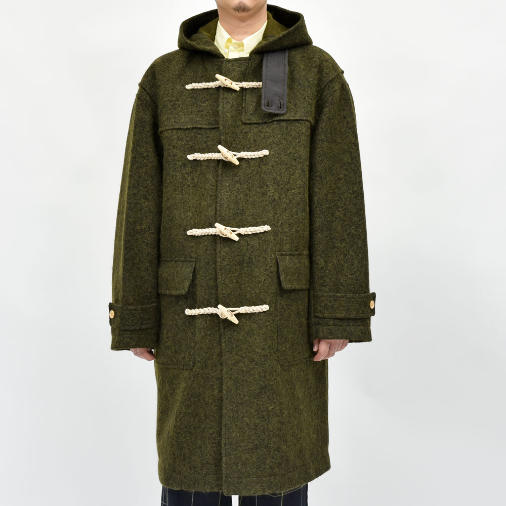 mando(マンド)のダッフルコート、縮絨ウールを用いたカーキグリーンの生地が目を惹く一着になっていまして、しっかりとウォーム感が伝わってくる生地使いになっています。シルエットは縦を意識したものになっていまして、袖、身頃もストンとまっすぐ落ちていくような形に。