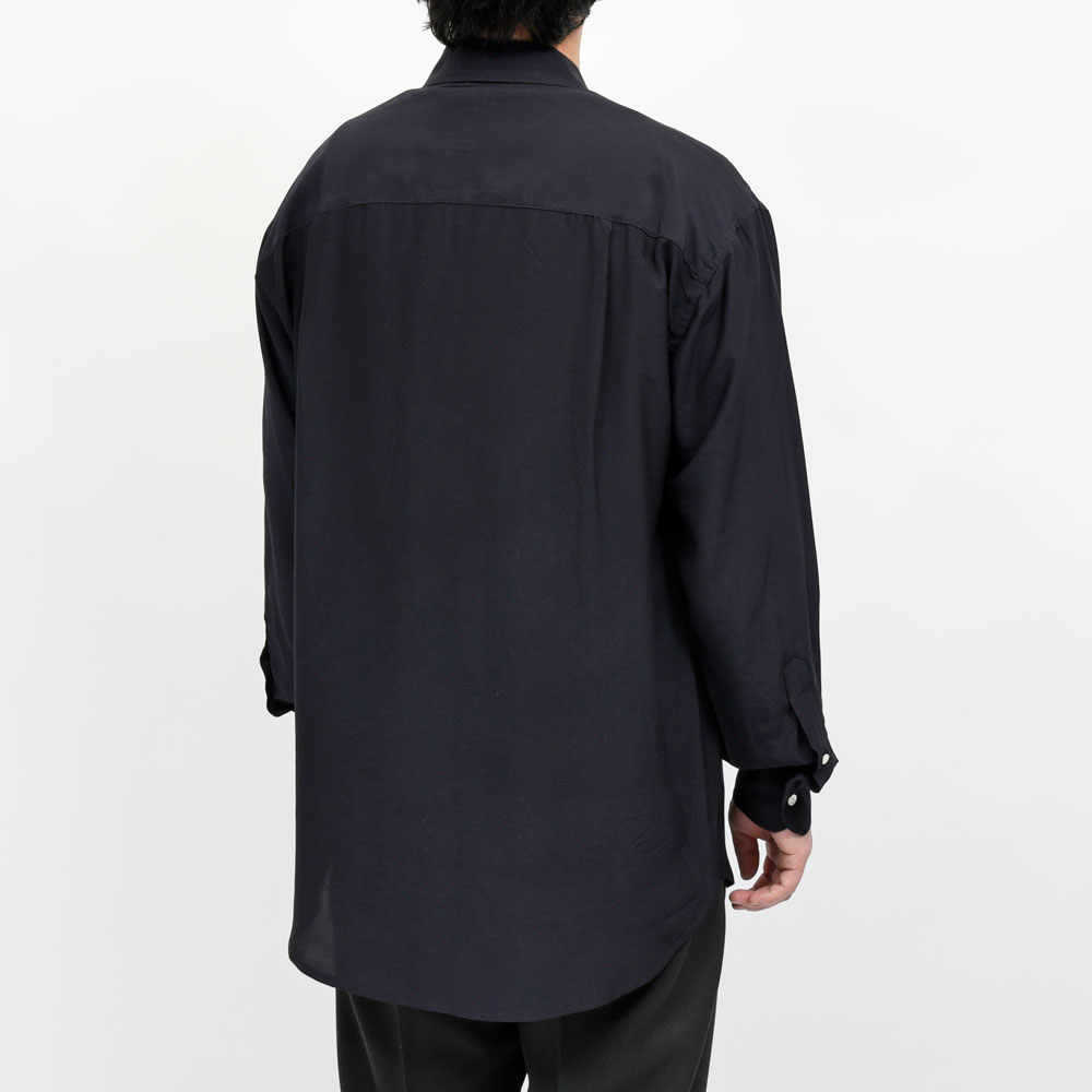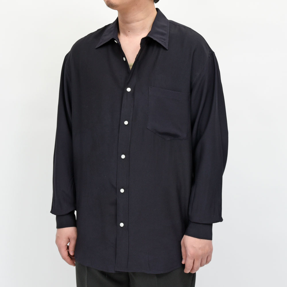 mando(マンド)のレーヨンシルクシャツ、まるでナイトウェアかのようなリラックス感と艶っぽさを思わせる一着になっています。カラーはシンプルにネイビーを採用、ブラックではないというところも日常使いしやすいポイントかもしれません。