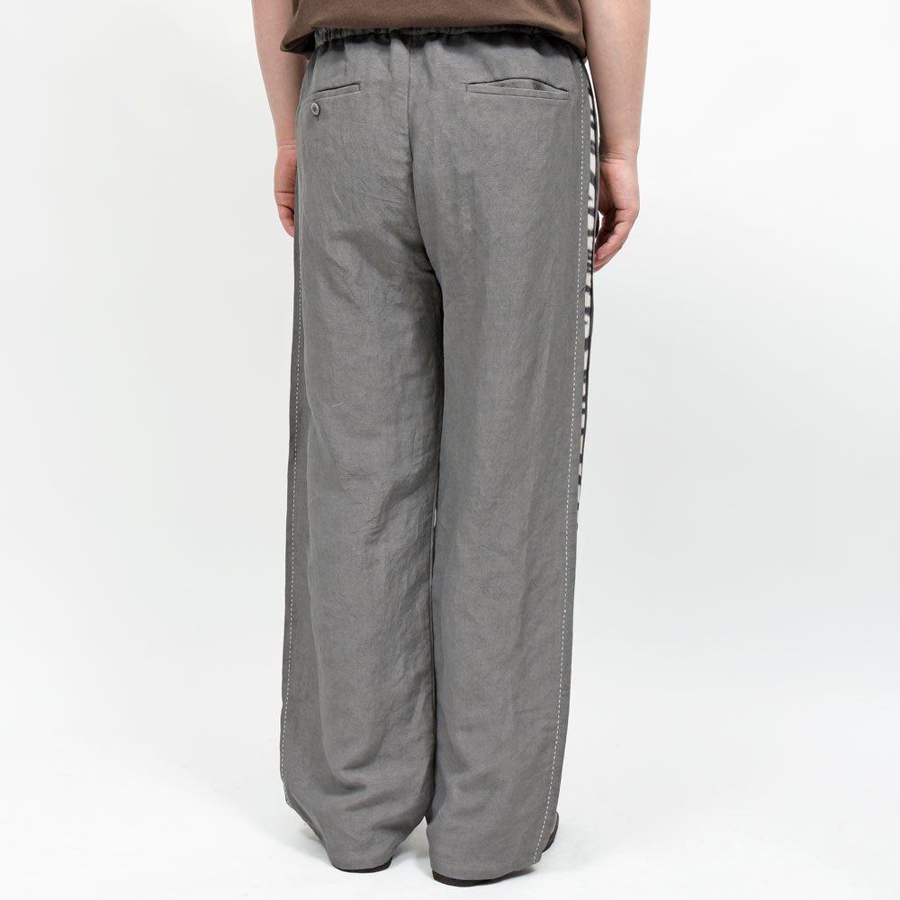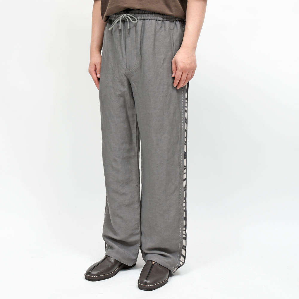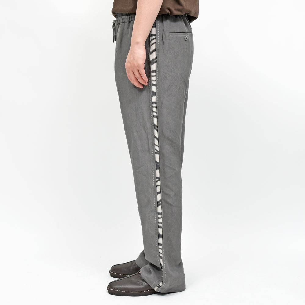 mando(マンド)のサイドラインパンツ、ブランドとして定番的に採用されているデザインの一つです。シャーリングタイプのストレートシルエットはお馴染みですが、生地はリネンレーヨンの硫化染めしたものを採用、さらにサイドライン部分はゼブラ柄となっています。