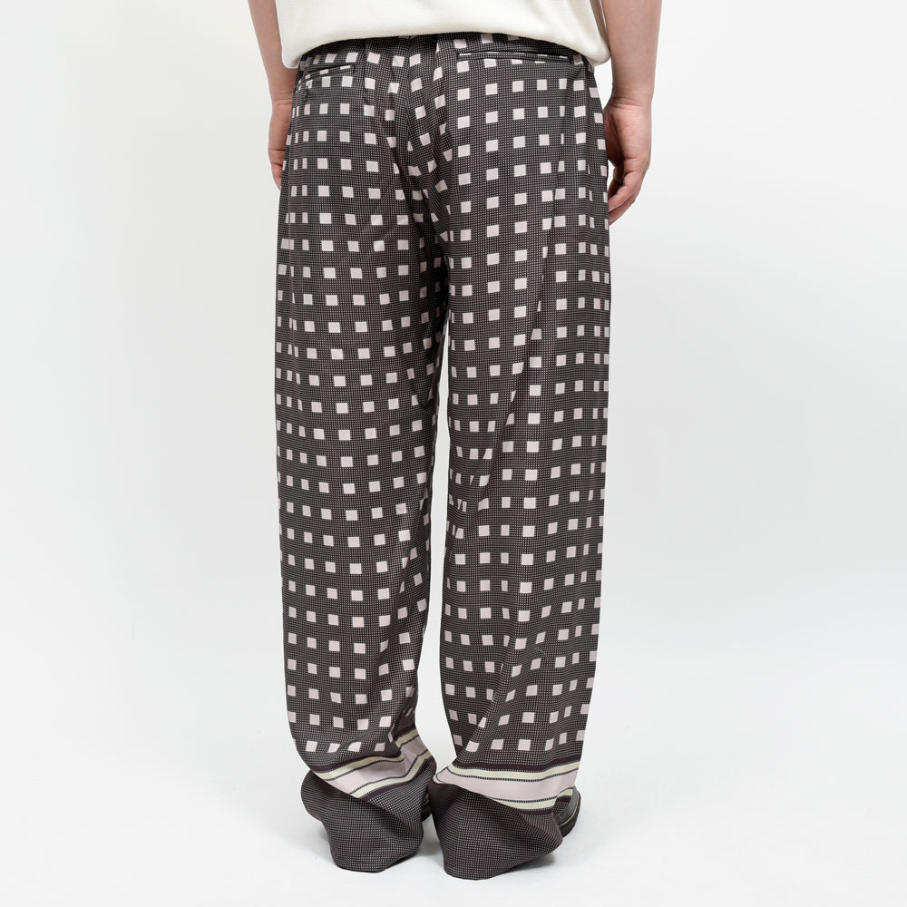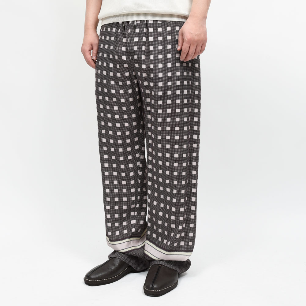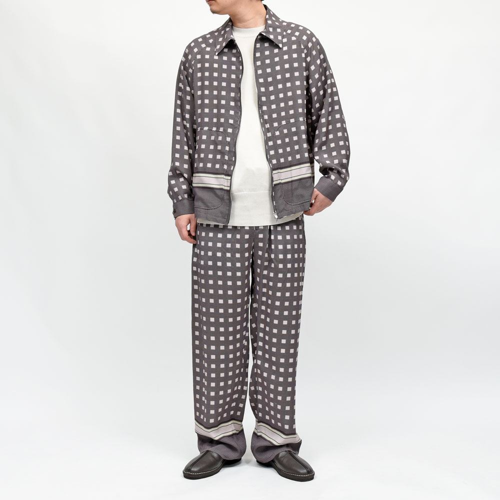 mando(マンド)のレーヨンキュプラプリントパンツ、シャーリング仕様のイージーパンツですが、幾何学調の模様が施されることにより秩序と遊び心を同時に感じさせる印象のパンツになっています。