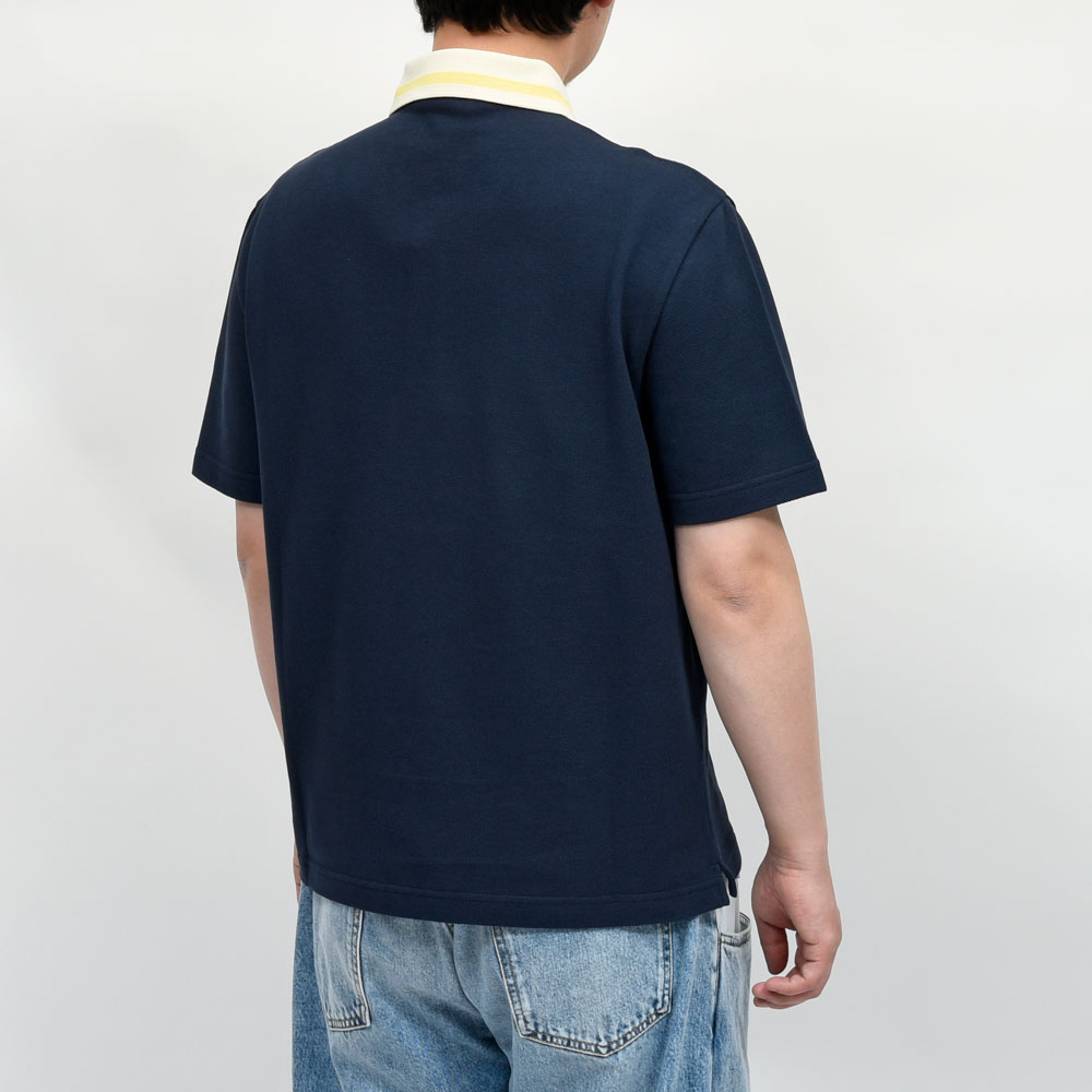 襟部分はストライプを採用する事で、全体の抜け感をうまくコントロールしている印象です。またストライプのカラーに呼応して胸元のロゴも同色にする事で親和性を高めているのもポイント。