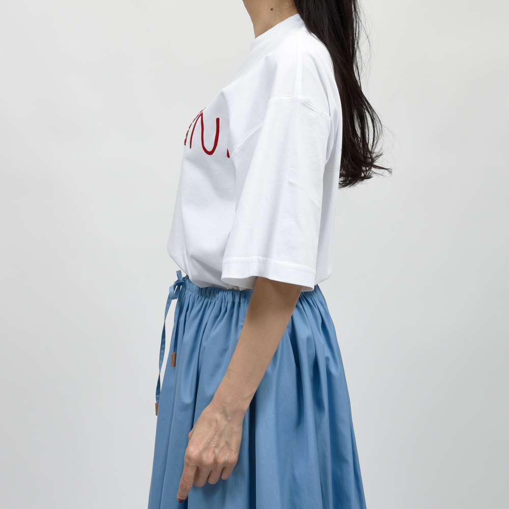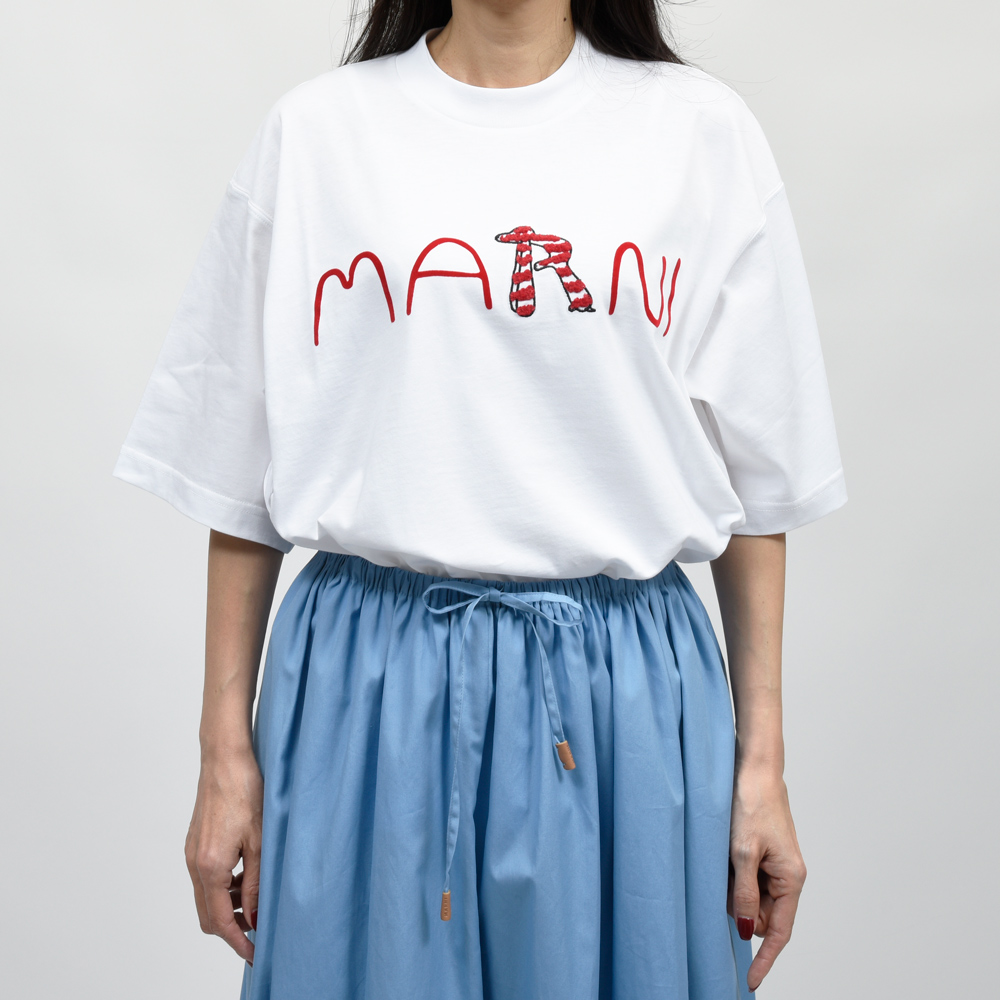 いわゆるロゴTシャツもMARNI(マルニ)の手にかかると一味違った雰囲気になります。Rの部分を動物に見立てたデザインになっていまして、おそらくは犬モチーフという感じです。