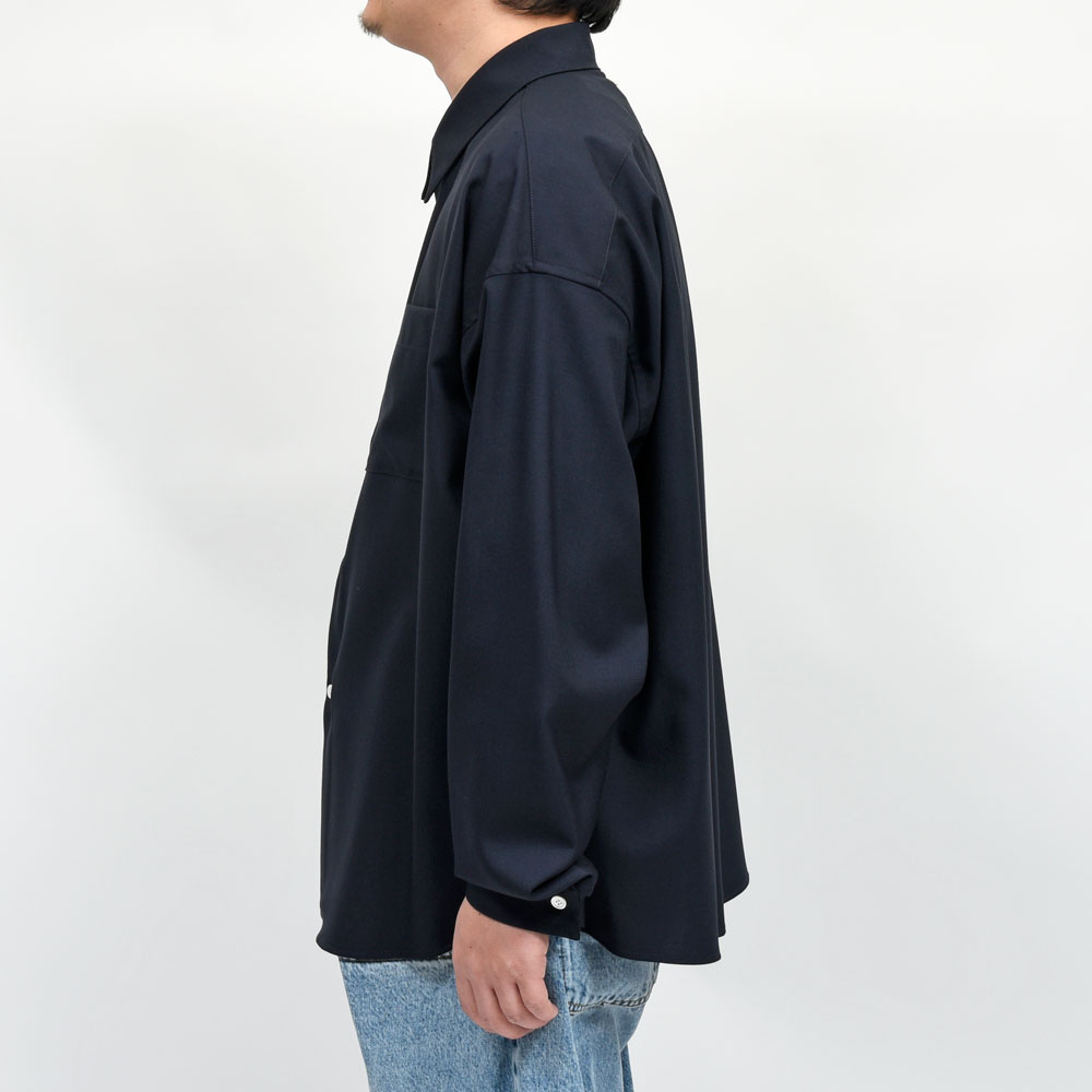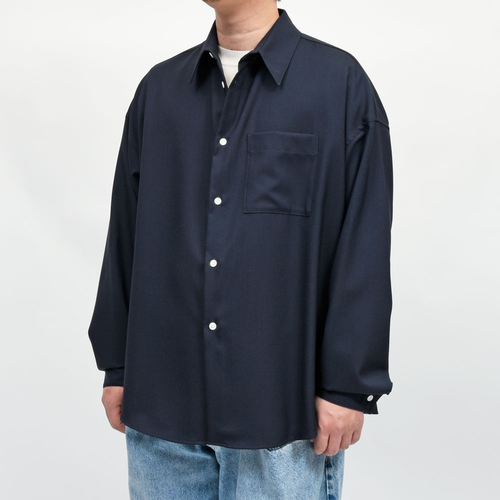ウール素材というのもポイントでして、コットンよりもクリーンでシャキッとしつつ、それでいて滑らかなドレープ感も演出出来てしまうのも素敵。大人の男性が着用できるリラックスシャツの完成系がここにあるように思います。