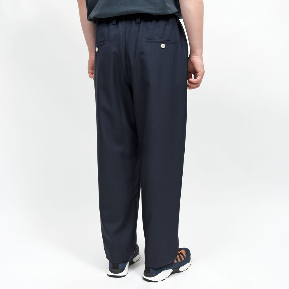 生地はウールなのでシワになりづらく、ウエストはシャーリング仕様になっているのであまり体重の増減に左右されず穿くことができるのも地味に高ポイント。誰が穿いてもリラックス感と上品さをうまいバランスで演出できてしまう間違いがない一本。