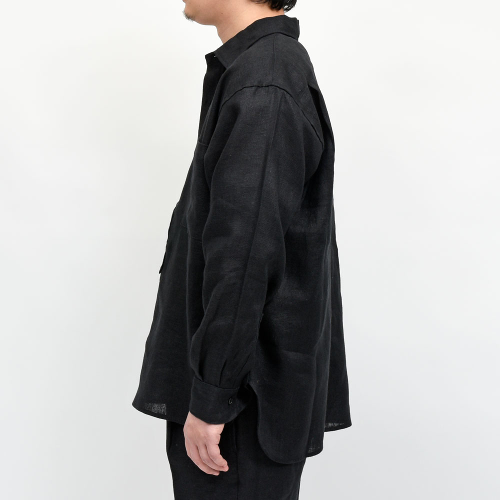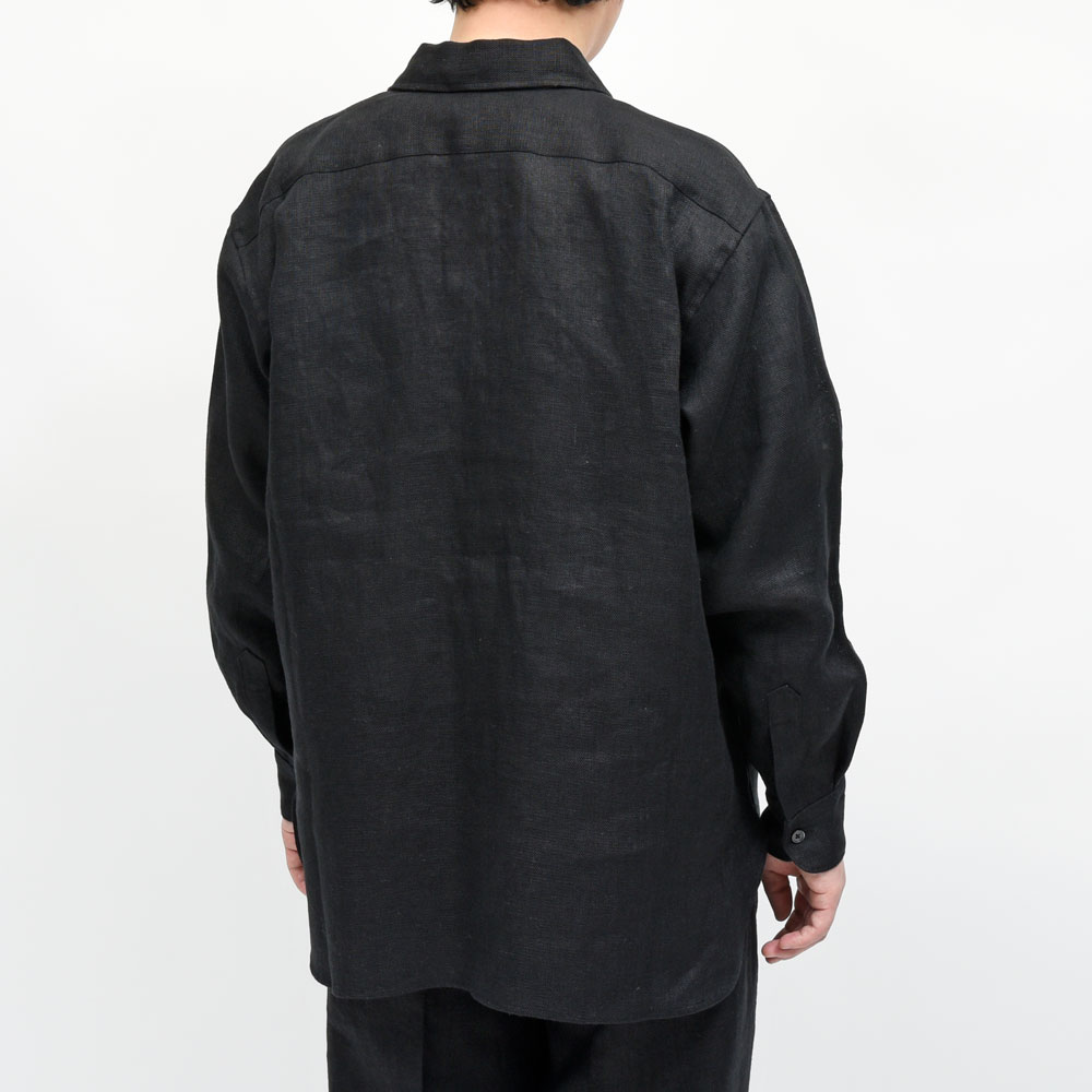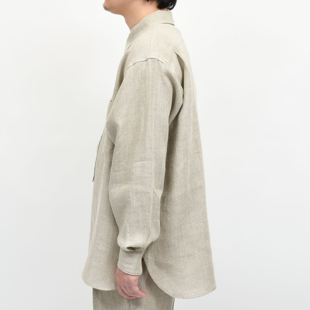 春夏シーズンには欠かすことが出来ない素材であるリネンを使った一着。ややざっくりとした生地感ではありますが、ほんのりと光沢感もあり上品さと抜け感が上手くミックスされている印象。