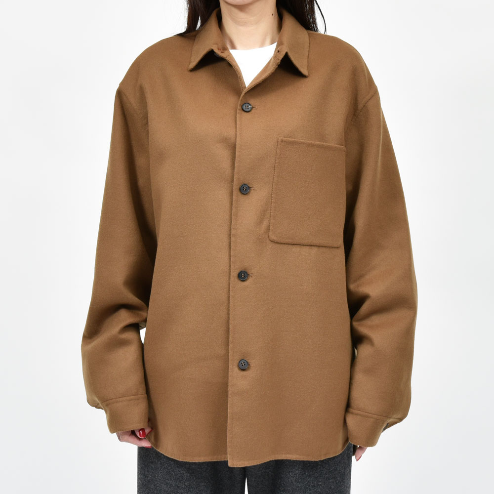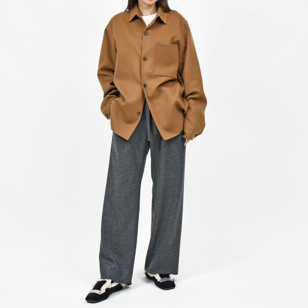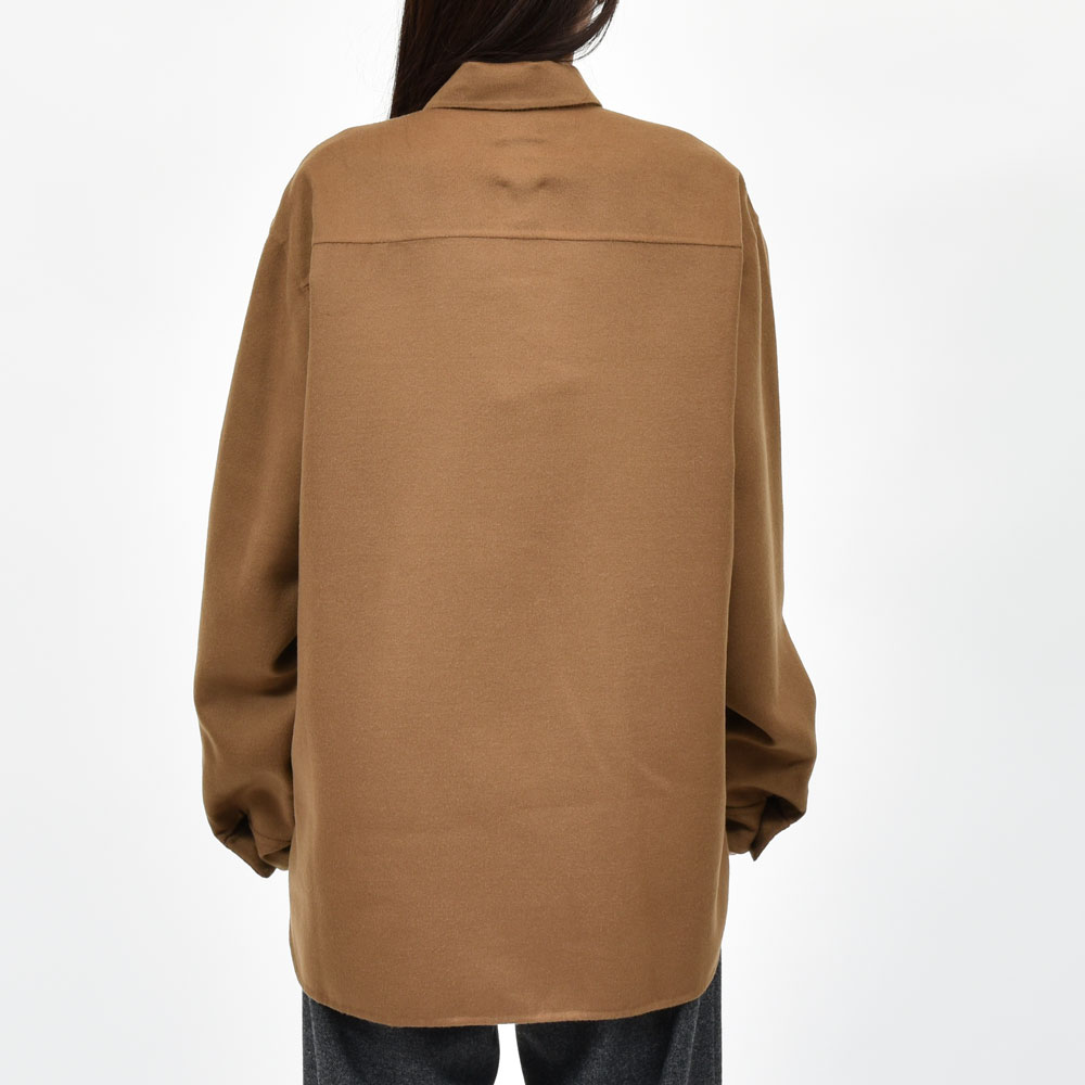 SUPER110’のダブルフェイス生地を採用したシャツ。大きめの胸ポケットなどカジュアルな仕様のアイテムではありますが、生地の上質さで柔らかな光沢感とドレープが生まれています。
