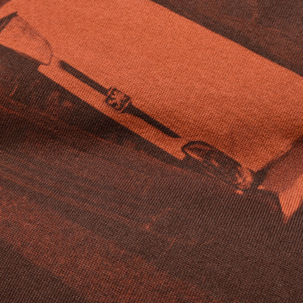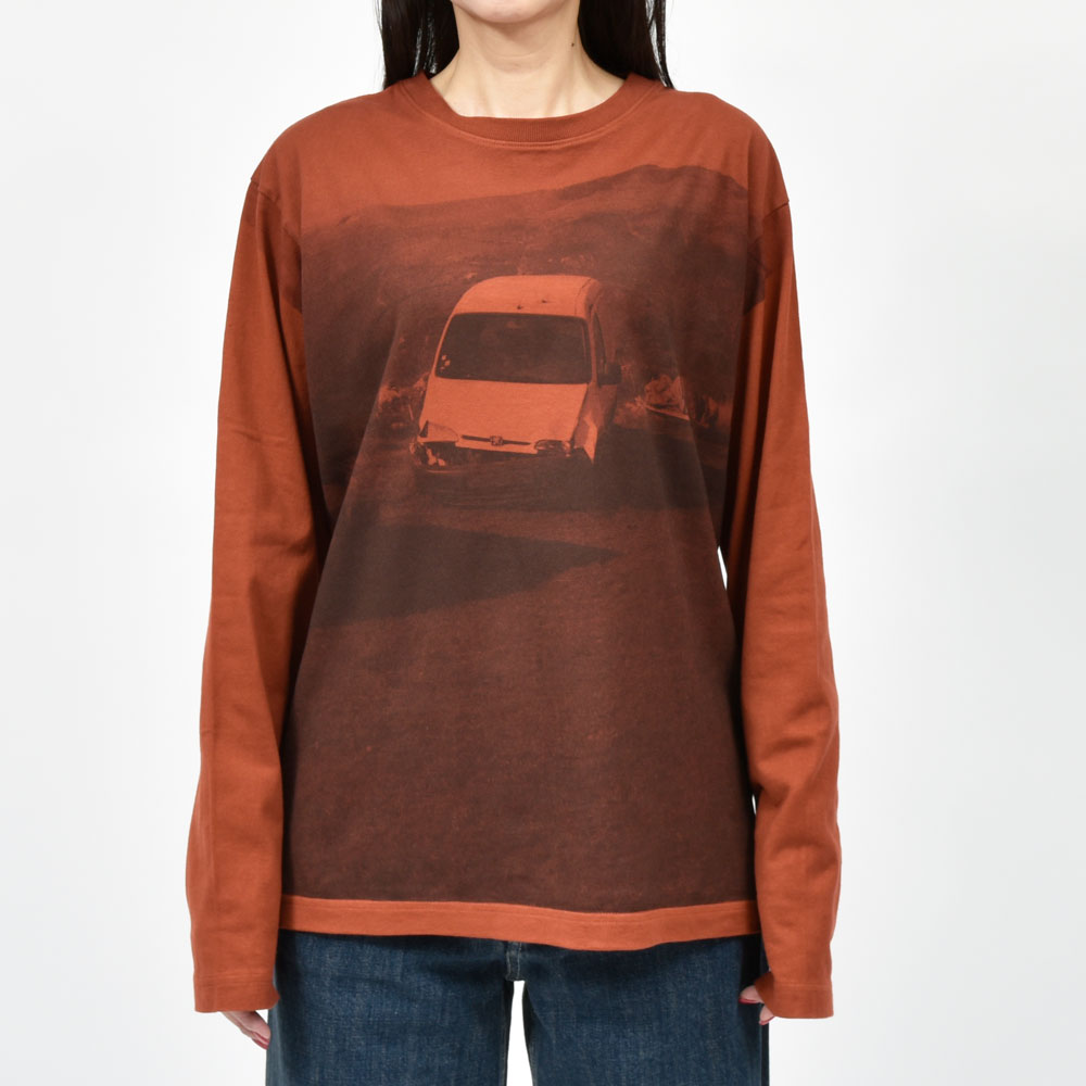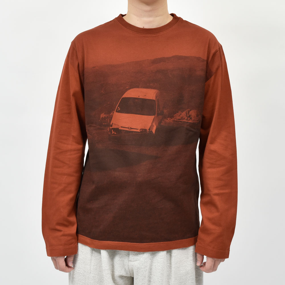 身頃全面に写真がプリントされた一着はルックブックを撮影しているJeff Boudreau氏のもの。フロントが破損したPEUGEOTが印象的、シルエットはスタンダードなタイプでして一枚着としては勿論のこと、インナーとしてアクセント使いも可能な存在となっています。