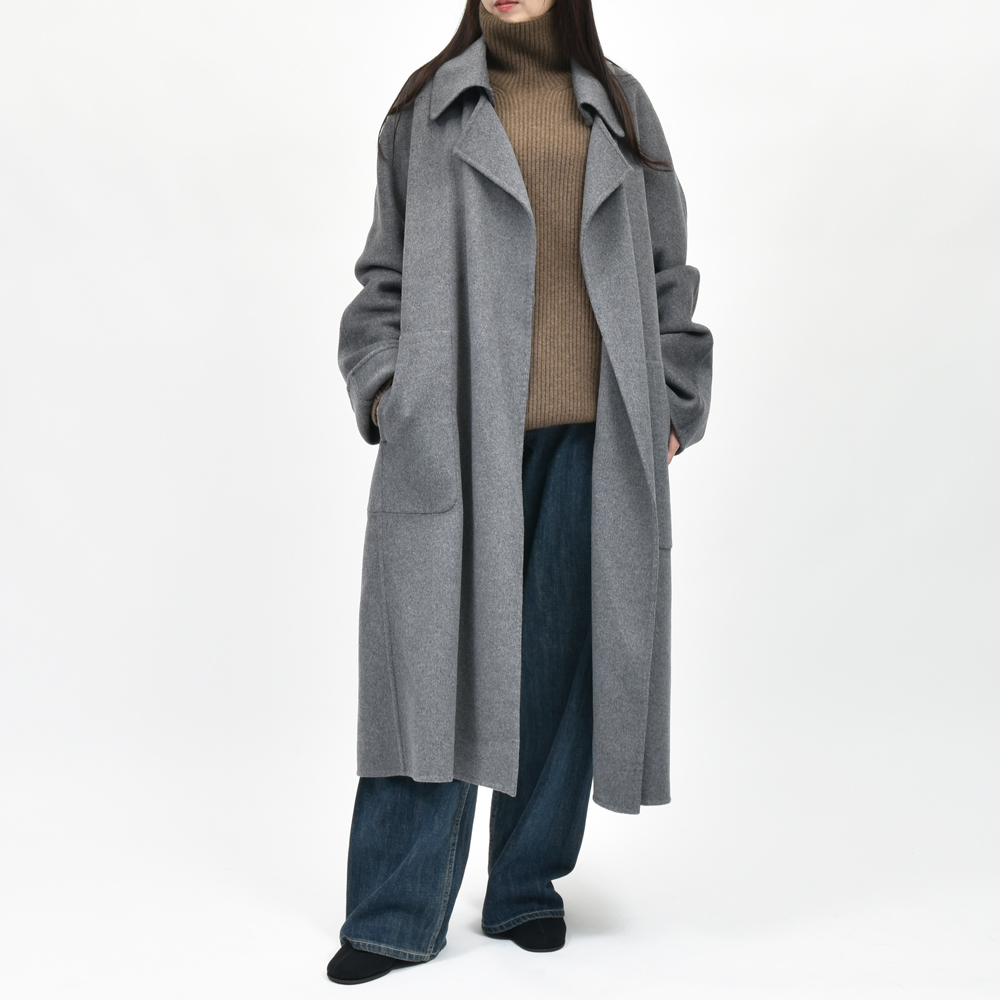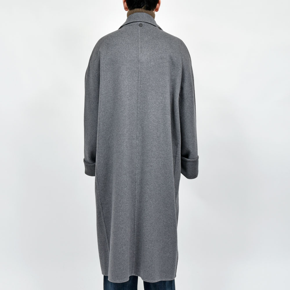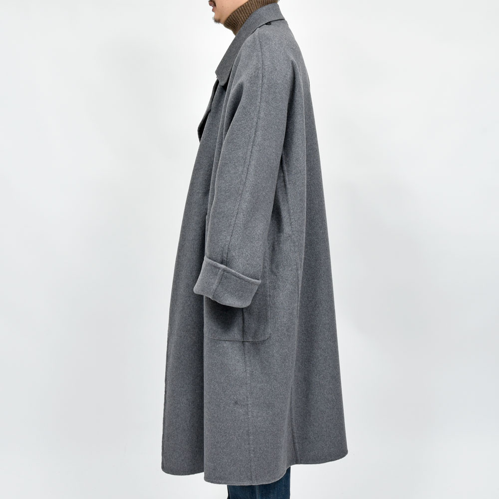 ブランドの定番的な一着として展開されているダブルフェイスのコート、今回はウールシルクのタイプに。気品を感じさせるタッチの生地とグレーの色合いにも目を奪われます。