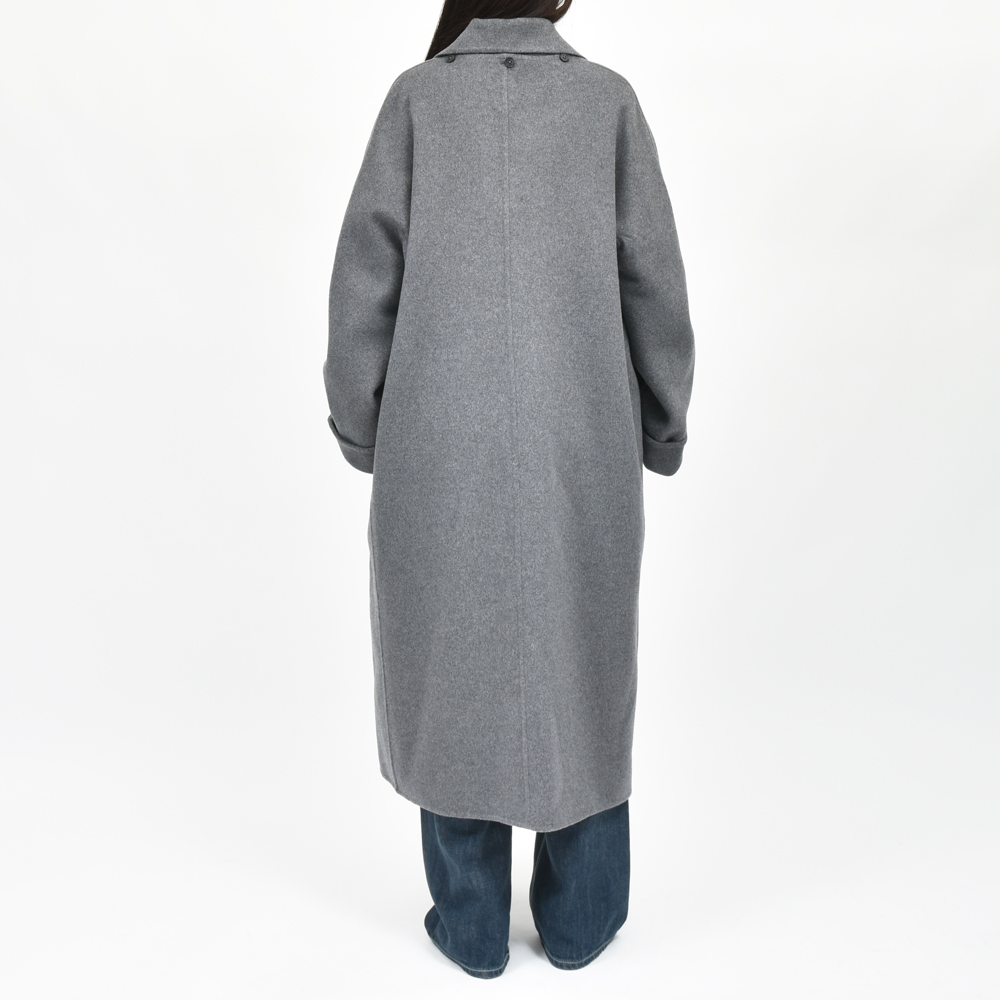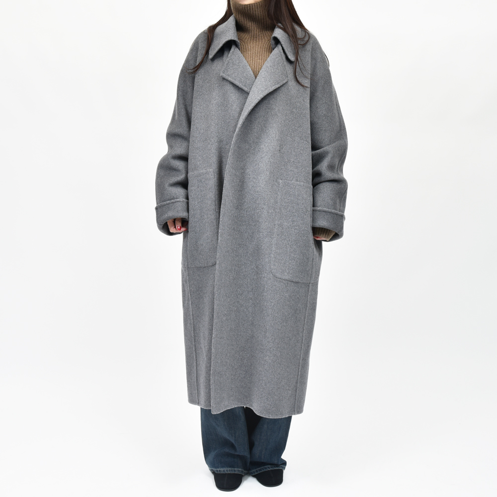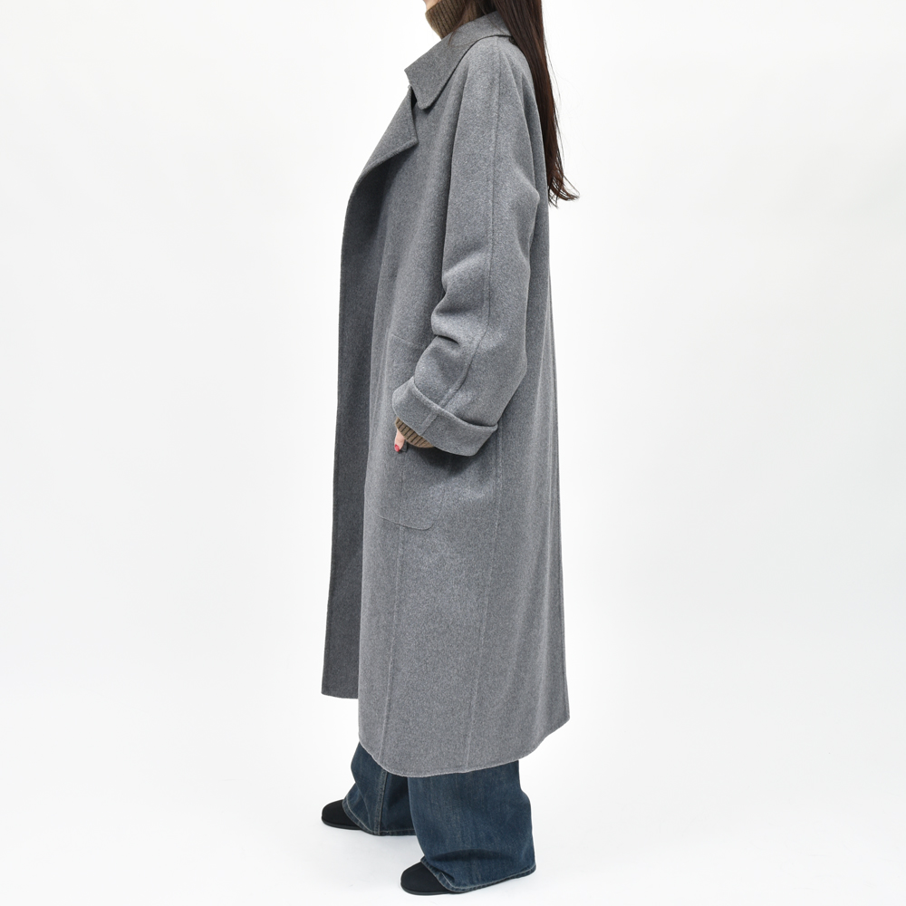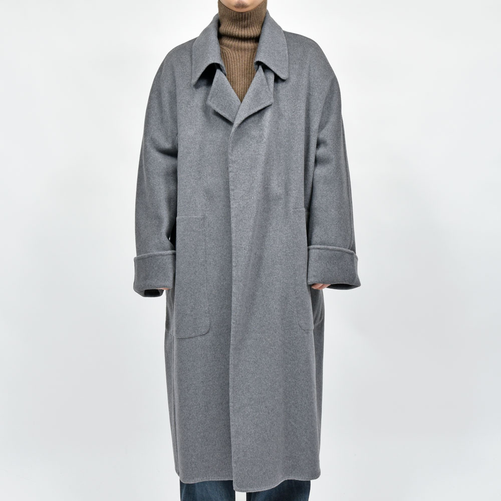 ブランドの定番的な一着として展開されているダブルフェイスのコート、今回はウールシルクのタイプに。気品を感じさせるタッチの生地とグレーの色合いにも目を奪われます。