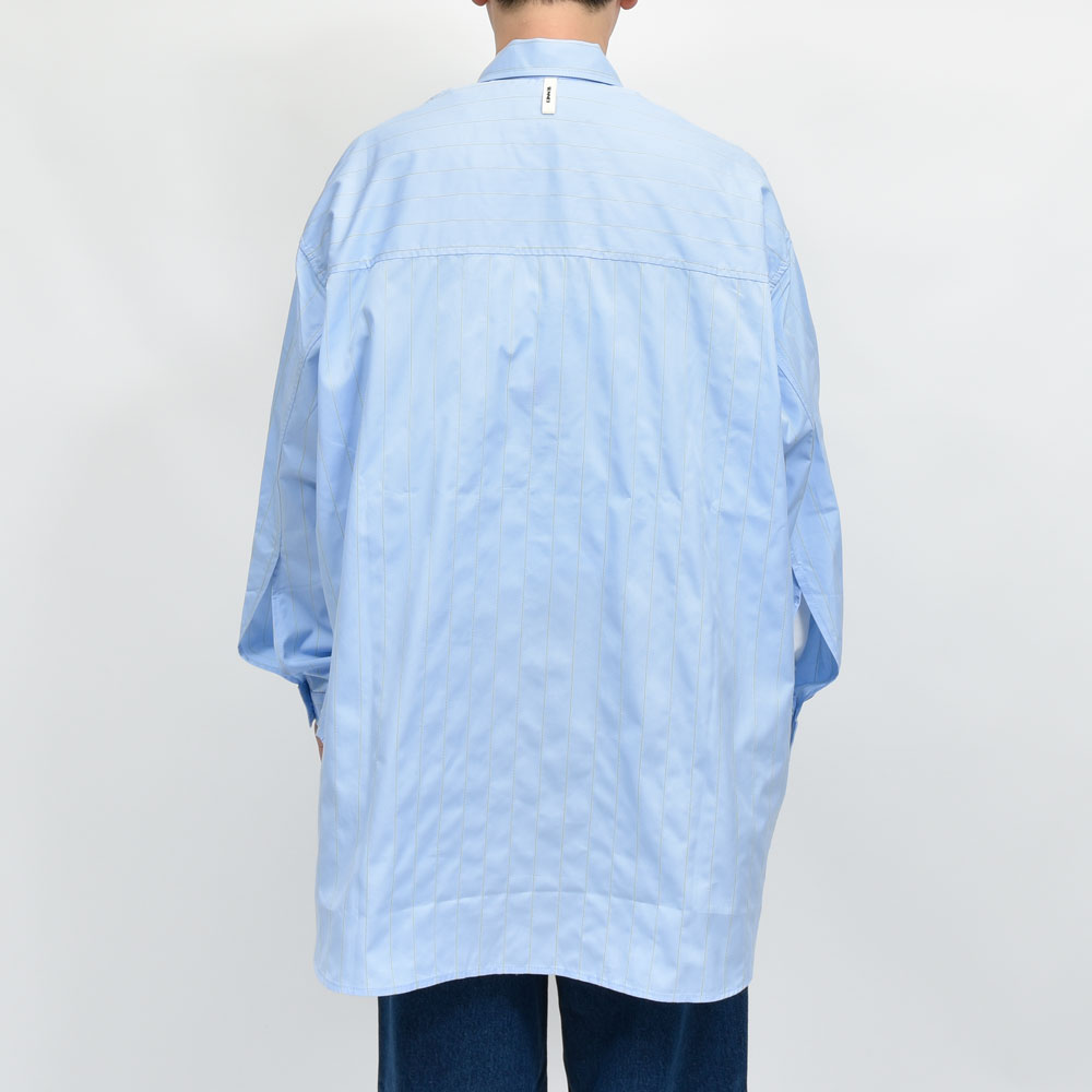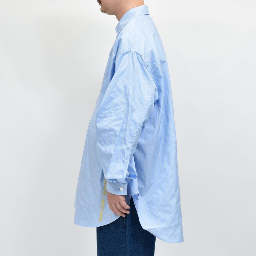 その名の通りメガでオーバーなシャツ、SUNNEI(スンネイ)らしいデザインの一着です。ライトブルーの生地にイエローのストライプはステッチで表現、さらに裾部分にはお馴染みのワードを入れることでポイントにしています。こういった表現方法はこのブランドならではの独自性が宿っていますね。