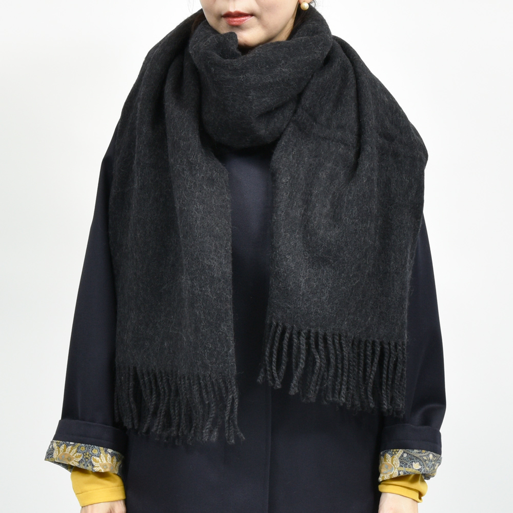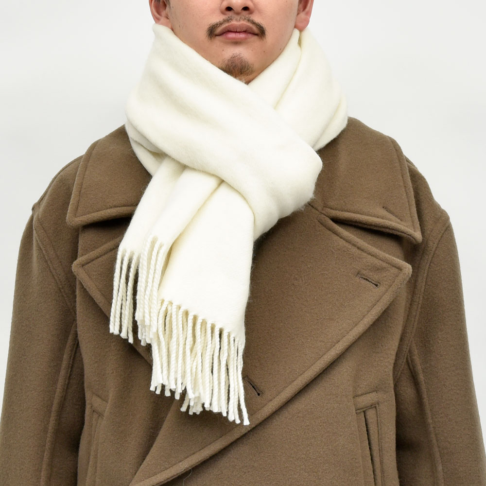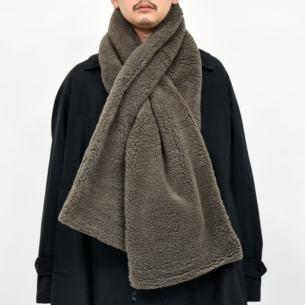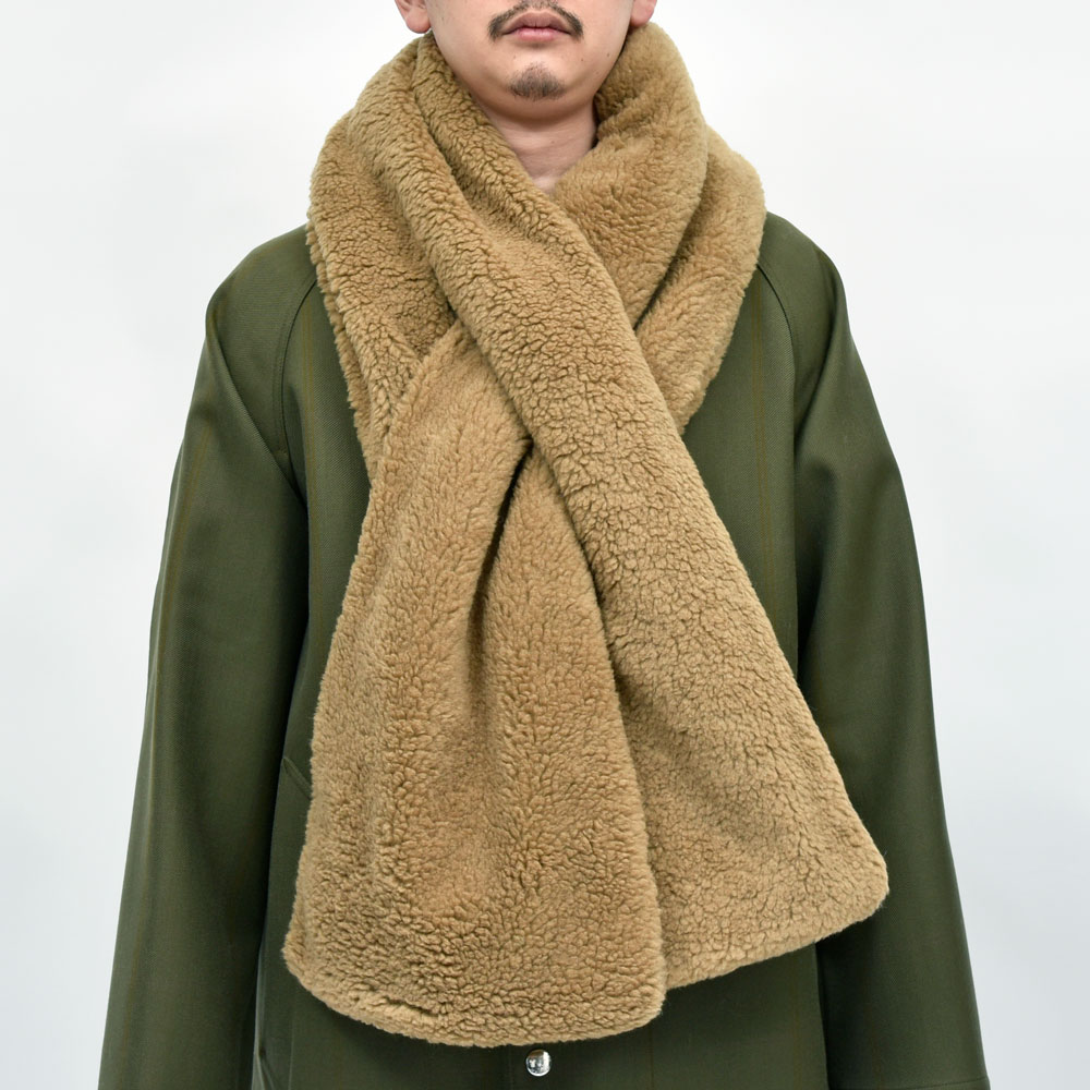 ウールを縮絨して膨らみを出すことで、ボリューム感をコントロール。巻いたときにいいバランスになってくれるものに。存在感がありつつ、デイリーに活躍してくれるストール、性別問わずお使いいただけるためパートナーとシェアしてもらうことが可能です。