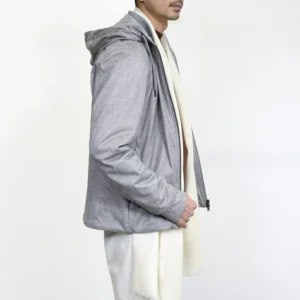 このタイプのアウターはフロントを全部閉めてジャージーパンツと合わせるのが定番かと思います。