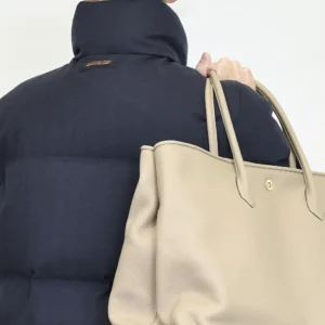 前述のスタイリングもそうですが、キャンバスバッグではなくレザーにすることでカジュアルになり過ぎずエレガントな要素も残しています。