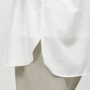 着こなしとしてはタックイン・アウトどちらも可能ですが、裾を出して着た際に綺麗に見えるよう後ろ身頃の分量を多く取っているのもポイント。