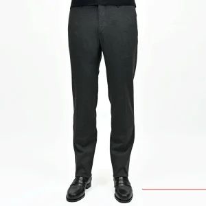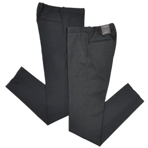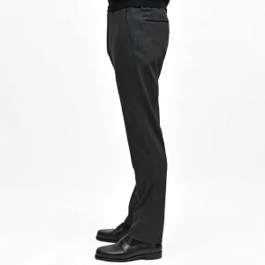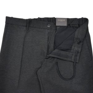 非常に伸縮性の高いスーパーストレッチ素材を使用しており、穿き心地はまさにジャージパンツ、しかし美しいシルエットのドレスパンツという見た目。