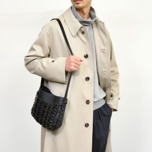 カチッとしながらも柔らかさを持たせており、バッグもクシャとしたレザーの表情が全体的に柔和な印象にしています。