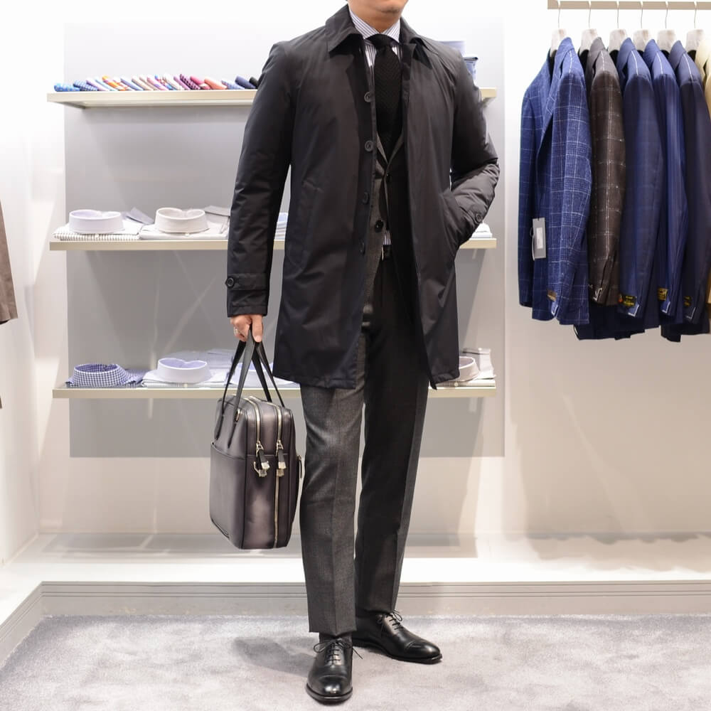 アウター:HERNO スーツ:RING JACKET シャツ:BARBA ネクタイ:SOZZI 靴:Crockett&Jones ベルト:ORCIANI 鞄:ARALDI1930
